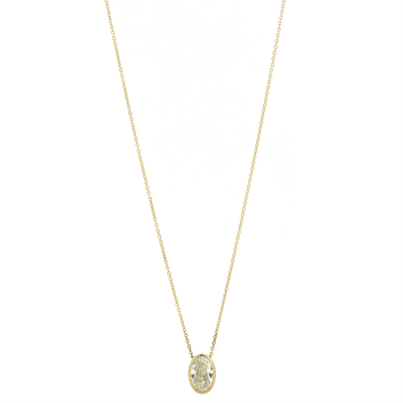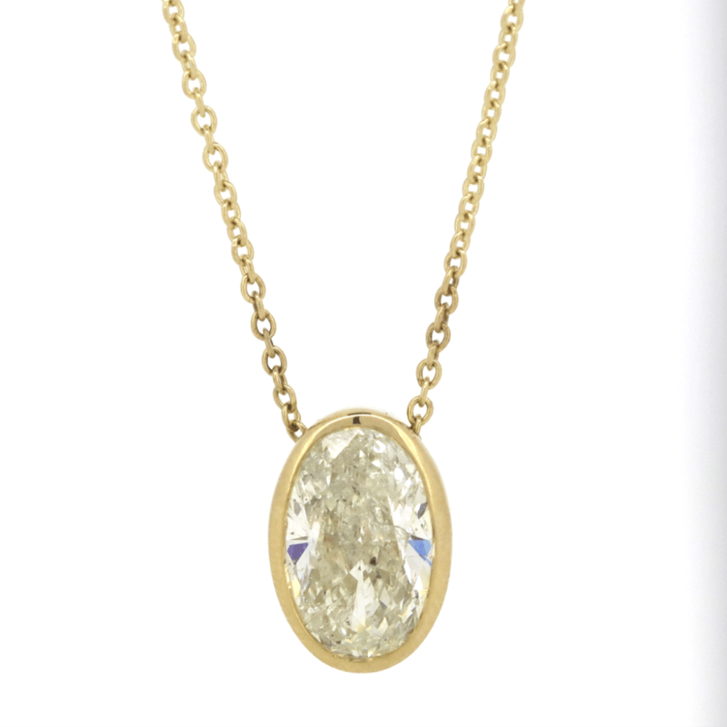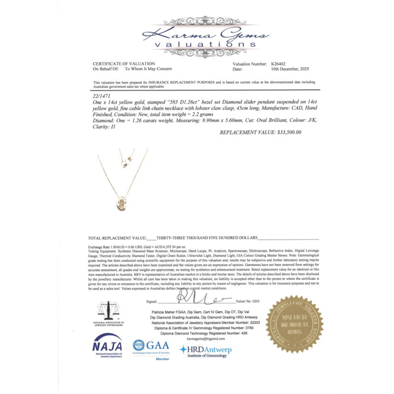 14K YELLOW GOLD AND DIAMOND, SLIDER PENDANT NECKLACE. The Pendant Features, One Oval Cut, Diamond (1.26Ct, J-K Colour, I1 Clairty), Bezel Set. The Slider Pendant Hangs On A 14K Yellow Gold Fine Cable Link Chain With A Lobster Claw Clasp And 45Cm Long. Valuations Provided by an Independent Third-Party Professional Not Directly Associated With Lloyds Auctions at AUD $$33,500.00This valuation has been conducted by an independent third-party professional. The valuation amount is an assessment by the issuing valuer and does not reflect the auction value of the item. Any inquiries regarding the valuation should be directed to the issuing valuer (refer to contact details on the certificate), as Lloyds Auctions has no affiliation or influence over the valuation, the valuer, or the stated amount. Condition: Good - Refer Images 0+5346