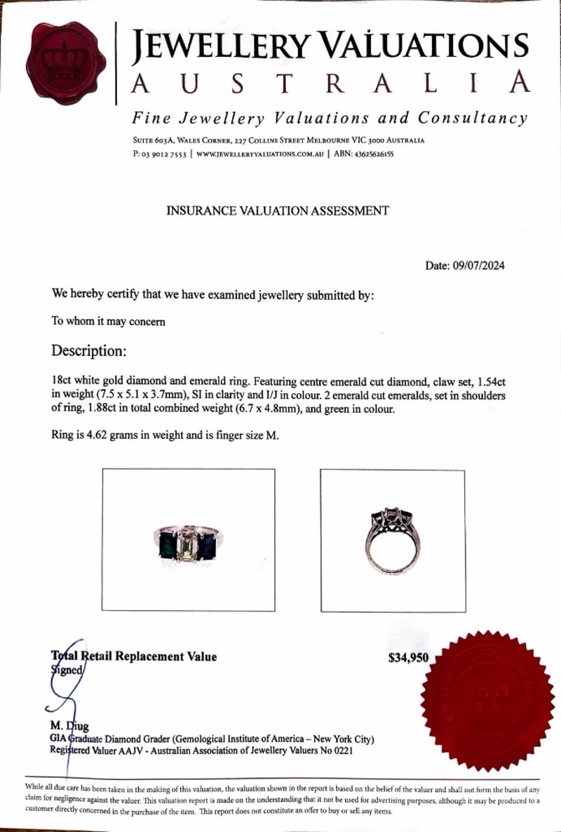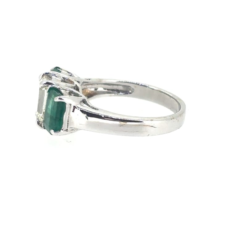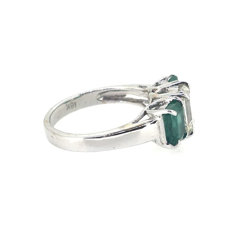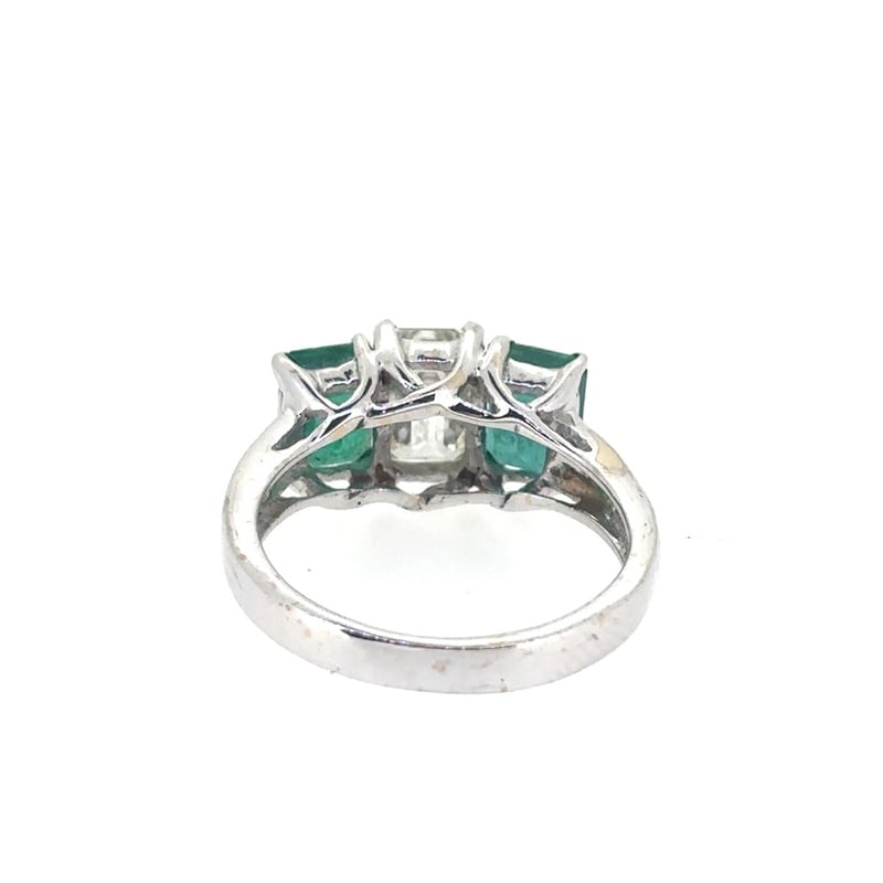 Featuring Centre Emerald Cut Diamond, Claw Set, 1.54Ct In Weight (7.5 X 5.1 X 3.7Mm), Si In Clarity And I/J In Colour. 2 Emerald Cut Emeralds, Set In Shoulders Of Ring, 1.88Ct In Total Combined Weight (6.7 X 4.8Mm), And Green In Colour. Finger Size M