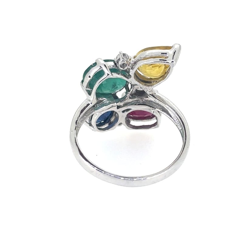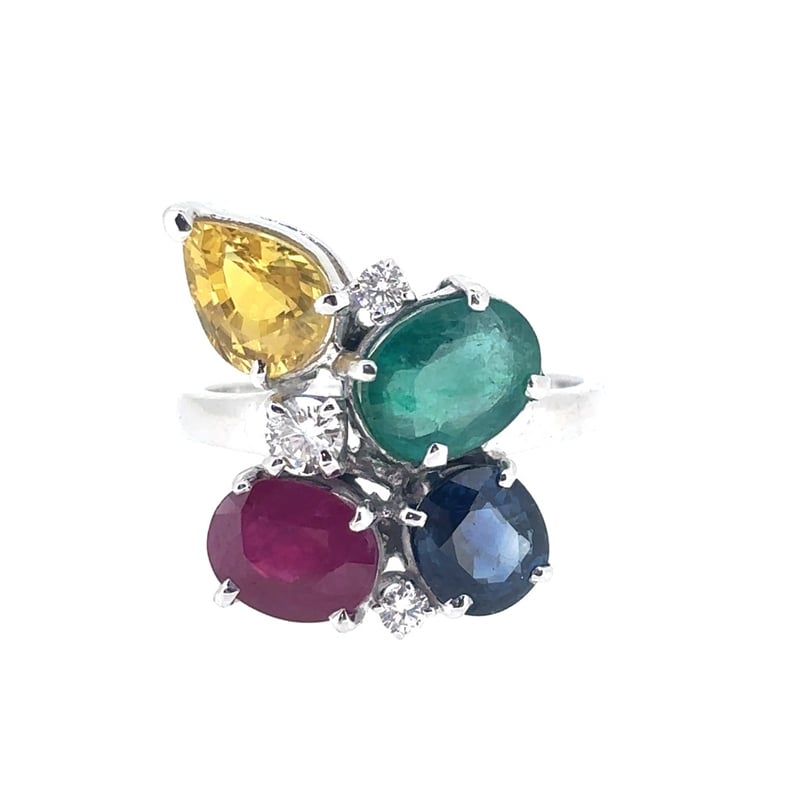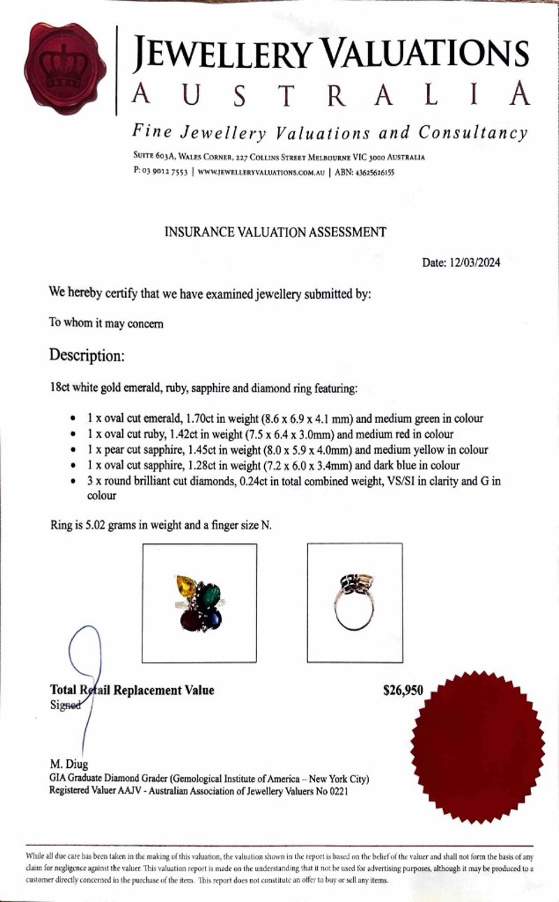 1 X Oval Cut Emerald, 1.70Ct In Weight (8.6 X 6.9 X 4.1 Mm) And Medium Green In Colour. 1 X Oval Cut Ruby, 1.42Ct In Weight (7.5 X 6.4 X 3.0Mm) And Medium Red In Colour. 1 X Pear Cut Sapphire, 1.45Ct In Weight (8.0 X 5.9 X 4.0Mm) And Medium Yellow In Colour. 1 X Oval Cut Sapphire, 1.28Ct In Weight (7.2 X 6.0 X 3.4Mm) And Dark Blue In Colour. 3 X Round Brilliant Cut Diamonds, 0.24Ct In Total Combined Weight, Vs/Si In Clarity And G In Colour. Finger Size N