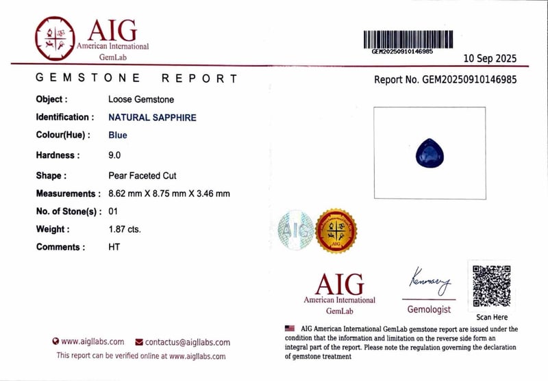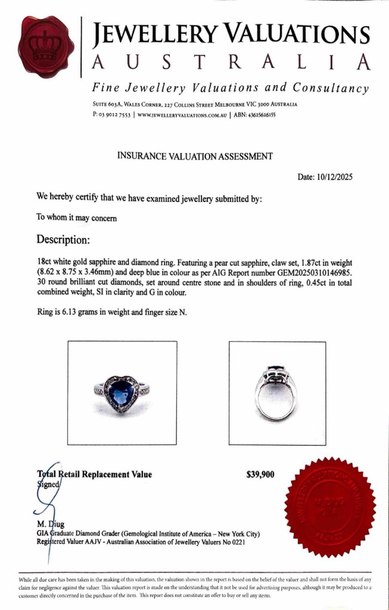 18CT WHITE GOLD SAPPHIRE AND DIAMOND RINGFeaturing A Pear Cut Sapphire, Claw Set, 1.87Ct In Weight (8.62 X 8.75 X 3.46Mm) And Deep Blue In Colour As Per Aig Report Number Gem20250310146985. 30 Round Brilliant Cut Diamonds, Set Around Centre Stone And In Shoulders Of Ring, 0.45Ct In Total Combined Weight, Si In Clarity And G In Colour. Finger Size NTotal Item Weight: 6.13gCondition: Good - Refer To ImagesThis valuation has been conducted by an independent third-party professional. The valuation amount is an assessment by the issuing valuer and does not reflect the auction value of the item.Any inquiries regarding the valuation should be directed to the issuing valuer (refer to contact details on the certificate), as Lloyds Auctions has no affiliation or influence over the valuation, the valuer, or the stated amount.Insurance Replacement Valuation Amount: $39,900.00CROSSDOCK163029+14