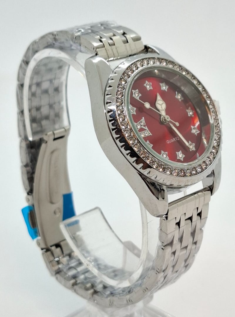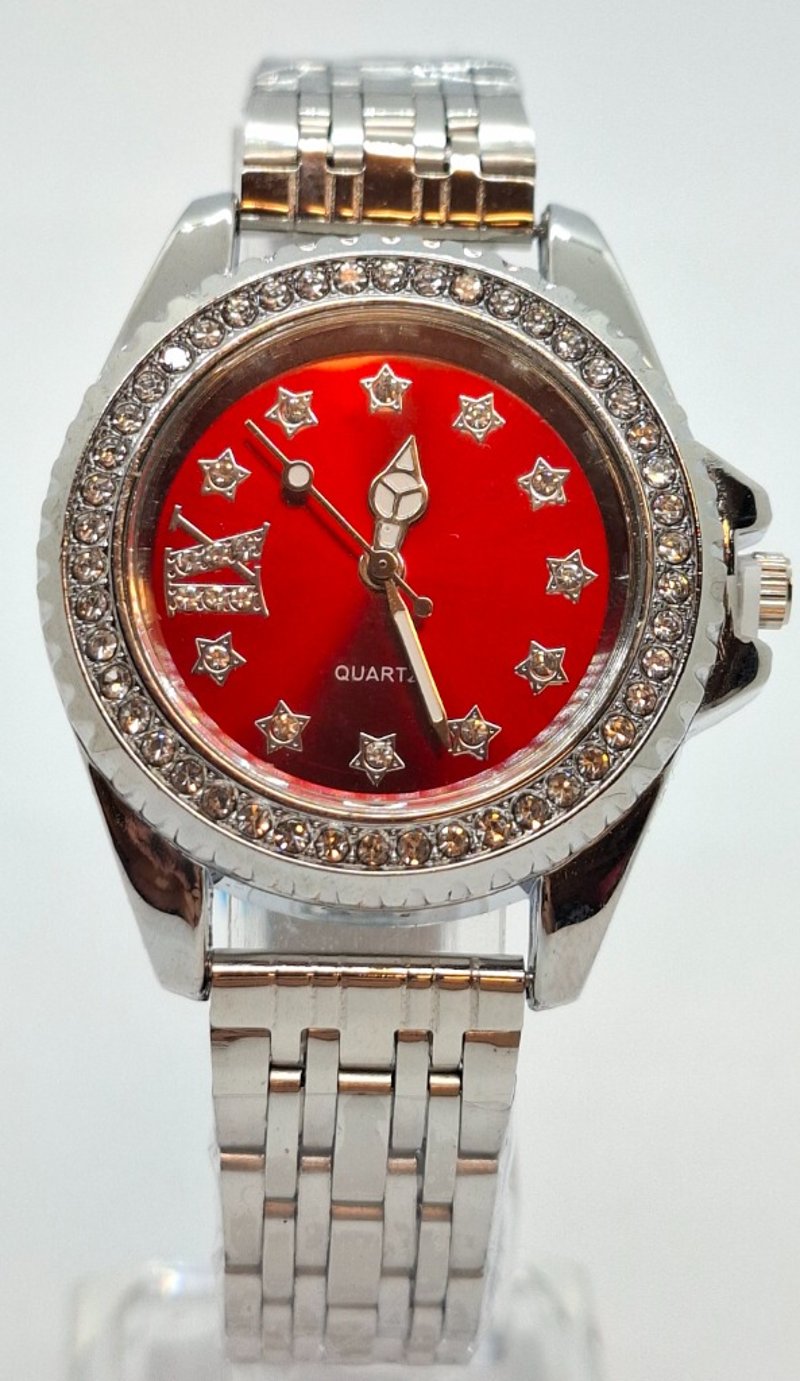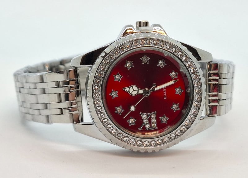 One Stainless Steel Banded Watch, Red Dial, Crystal Bezel