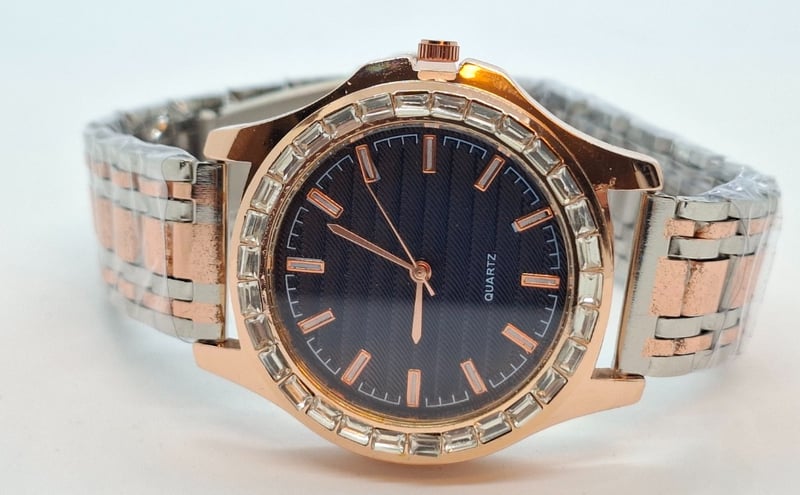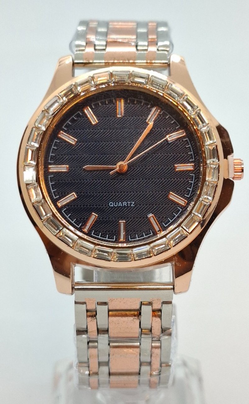 One Stainless Steel Rose-Gold Toned Watch, Black Dial