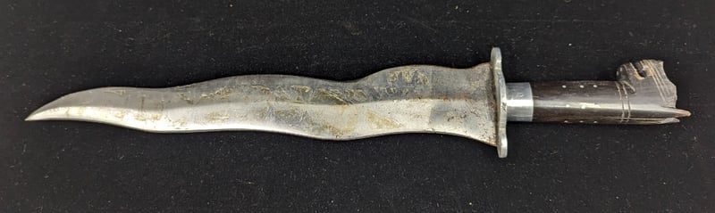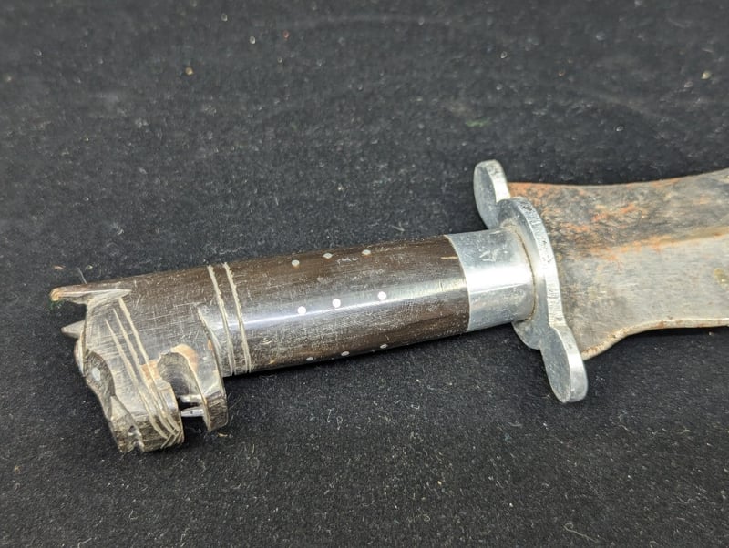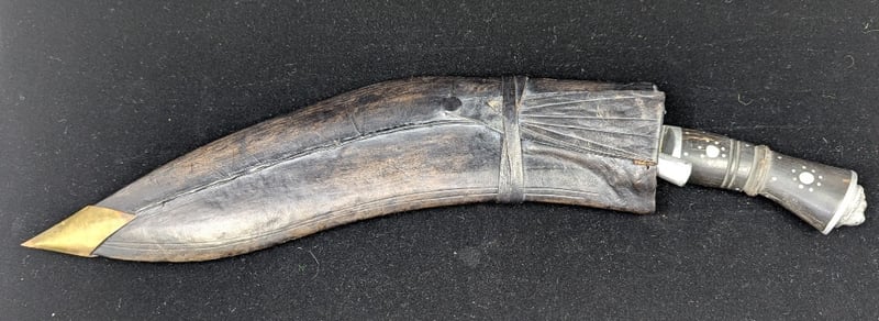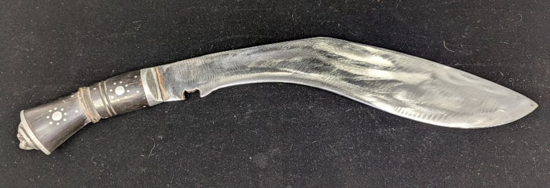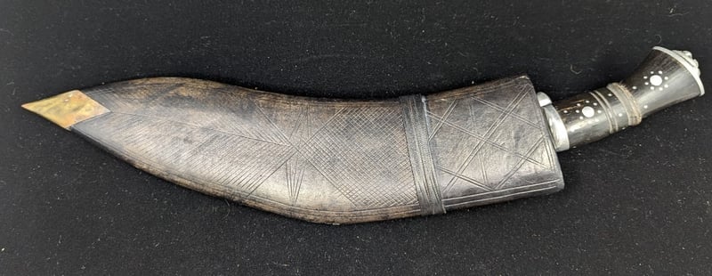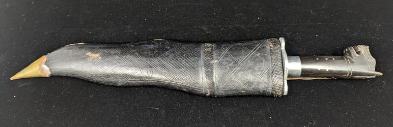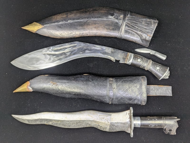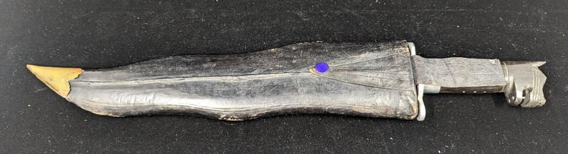 TWO NEPAL KNIVES WITH LEATHER STYLE HOLSTERSTwo Blade Styles, Timber Grips, One Grip Features Animal Head Style Pommel, Knife Length Approx: 40CmCondition: Good - Refer To Images11B586326+1
