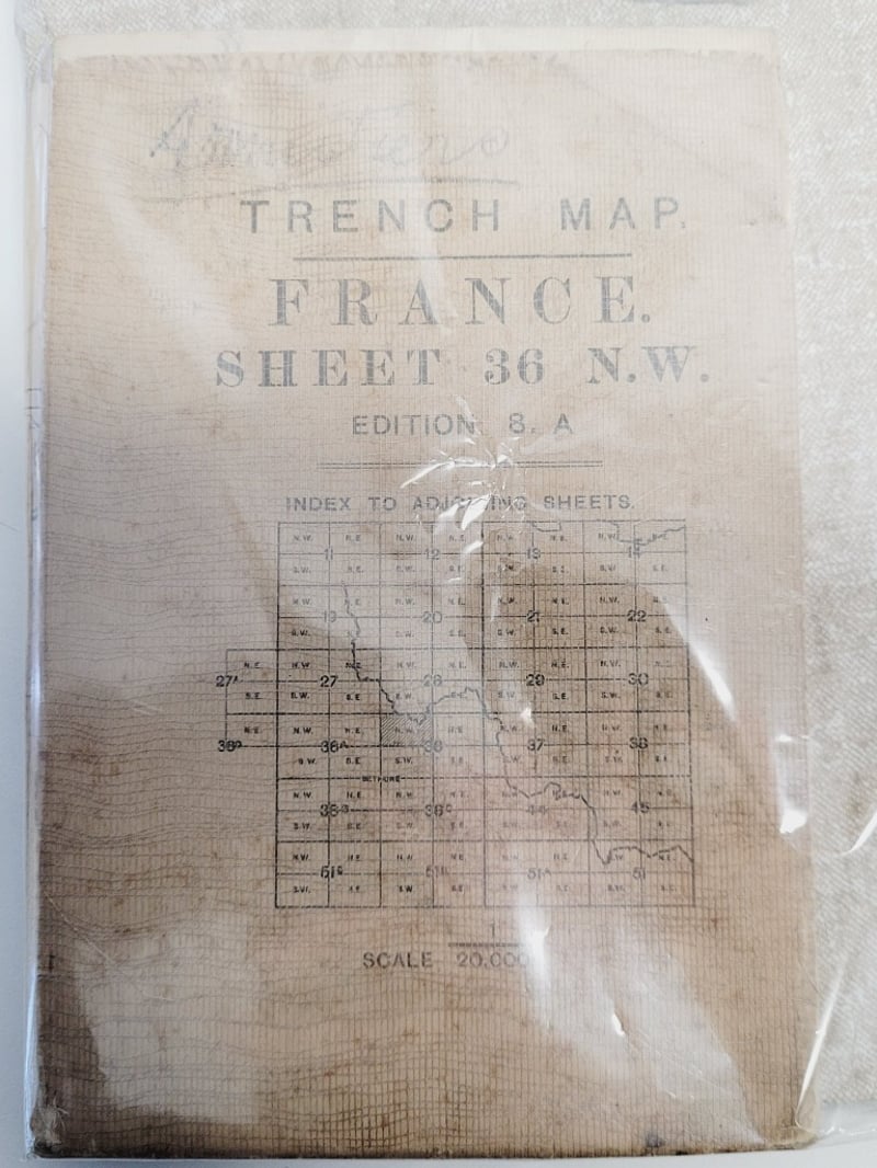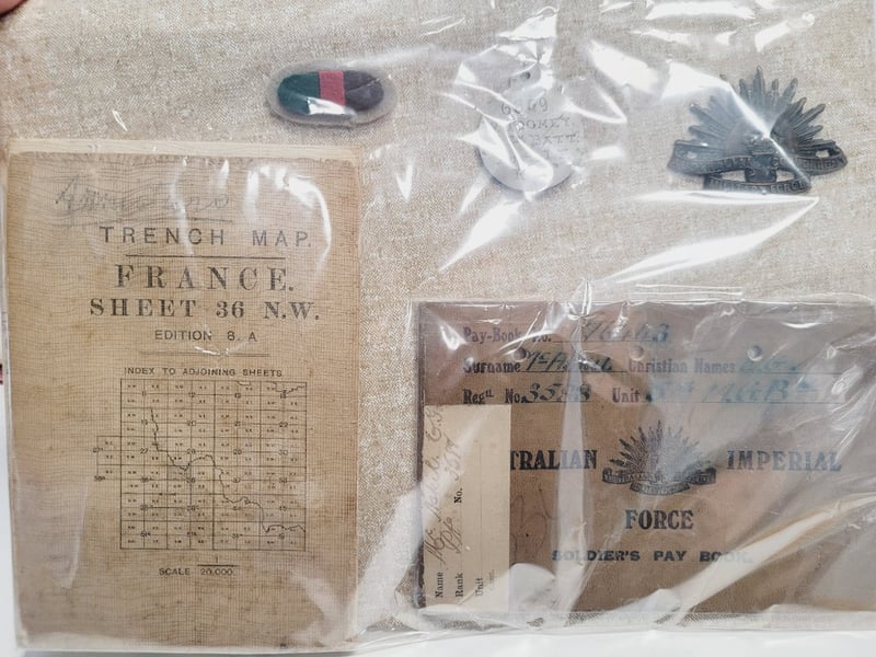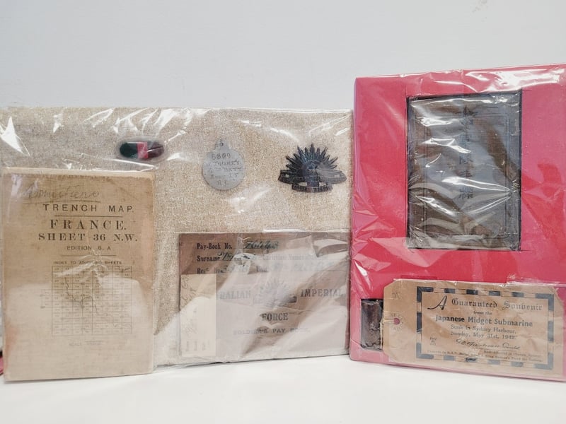 COLLECTION OF MILITARY MEMORABILIA, INCLUDING A WORLD WAR I TRENCH MAP AND ITEMS RELATED TO THE JAPANESE MIDGET SUBMARINE ATTACK ON SYDNEY HARBOUR IN 1942