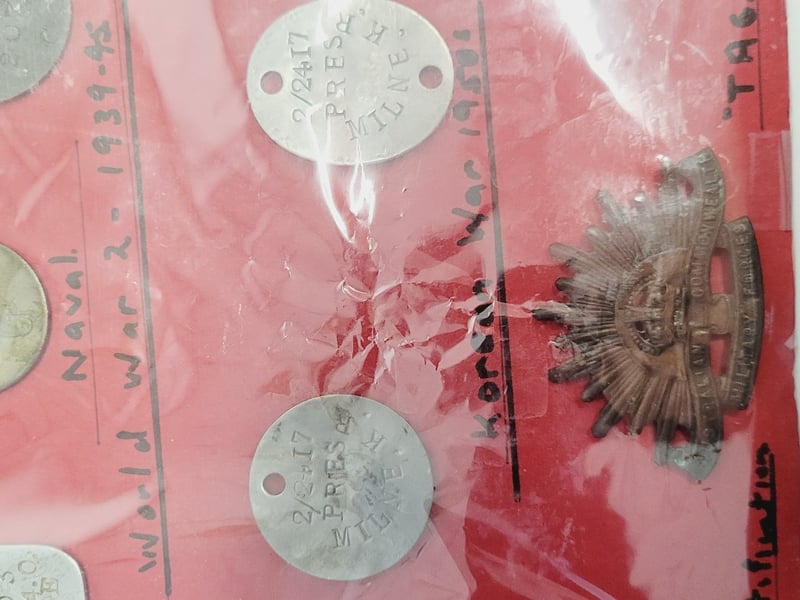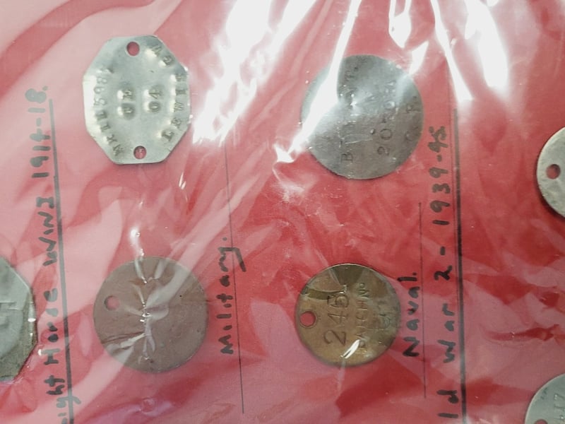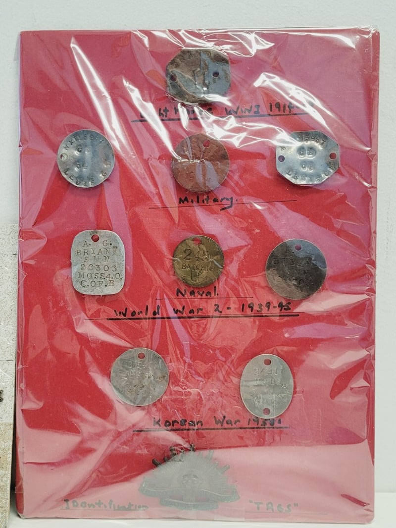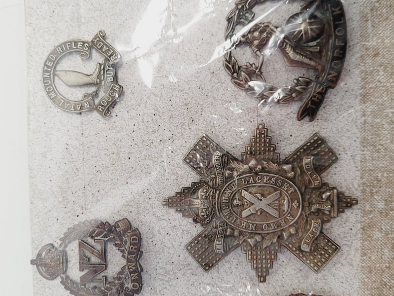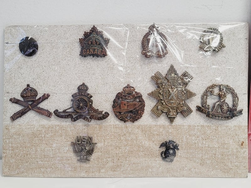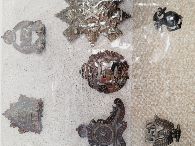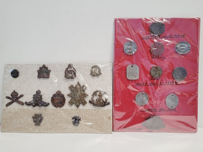 WORLD WAR I AND II MILITARY CAP BADGES, COLLAR BADGES, AND DOG TAGS