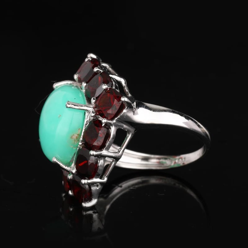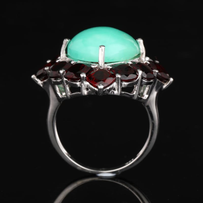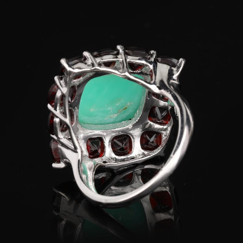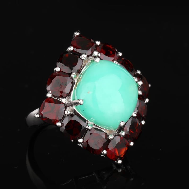Exquisite Crysophase & Garnet Cushion Ring Step into a world of elegance with this stunning ring featuring a captivating cushion-cut Crysophase, measuring an impressive 13.00mm. This rare gemstone, celebrated for its enchanting green hues and unique translucence, serves as the centerpiece of this luxurious piece. Surrounding the Crysophase are twelve splendid cushion-cut Garnets, each 5.00mm, expertly set to create a harmonious symphony of color and brilliance. The warm, rich tones of the Garnets beautifully complement the cool, ethereal glow of the Crysophase, creating a striking contrast that draws the eye and enchants the heart. Crafted with meticulous attention to detail, this ring is not just a piece of jewelry; it’s a statement of sophistication and a testament to timeless beauty. Perfect for any occasion, whether you’re looking to elevate your everyday ensemble or make a grand entrance at a lavish event, this exquisite ring is destined to become a cherished addition to your collection. Embrace the allure of this magnificent piece and let it tell your story of elegance and style.