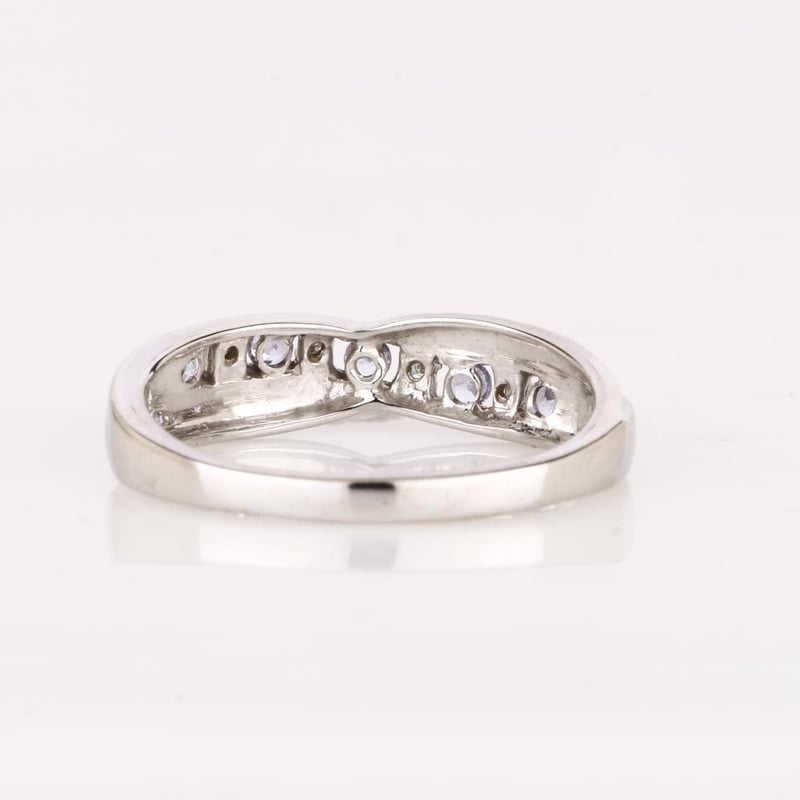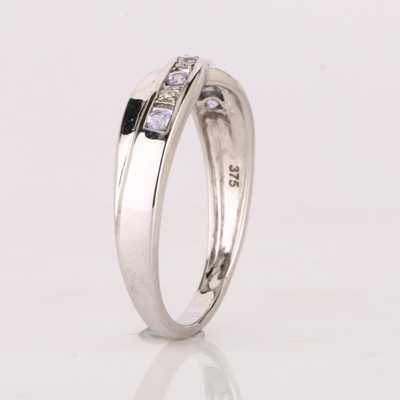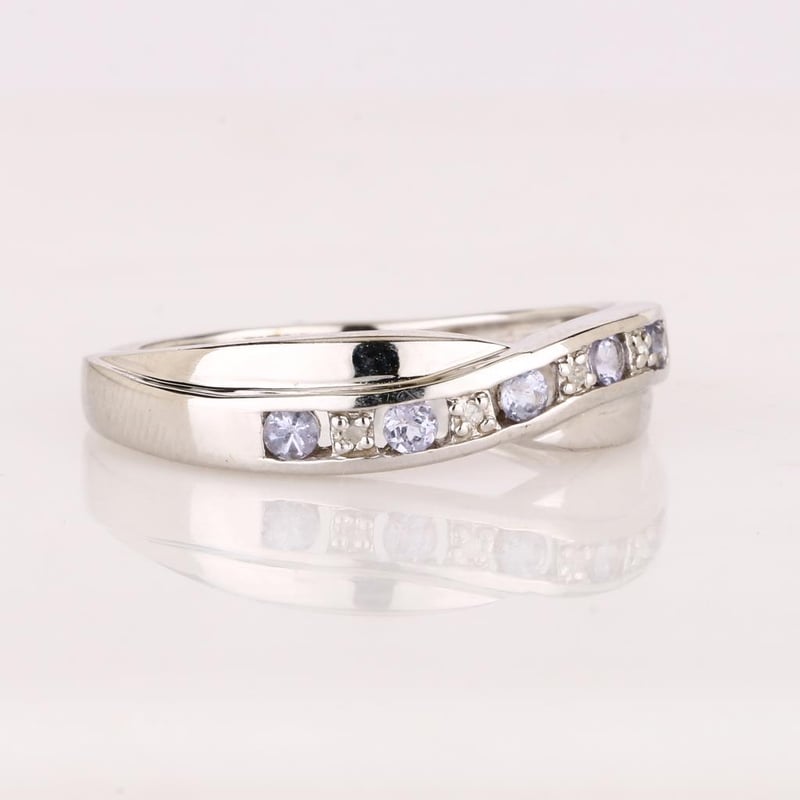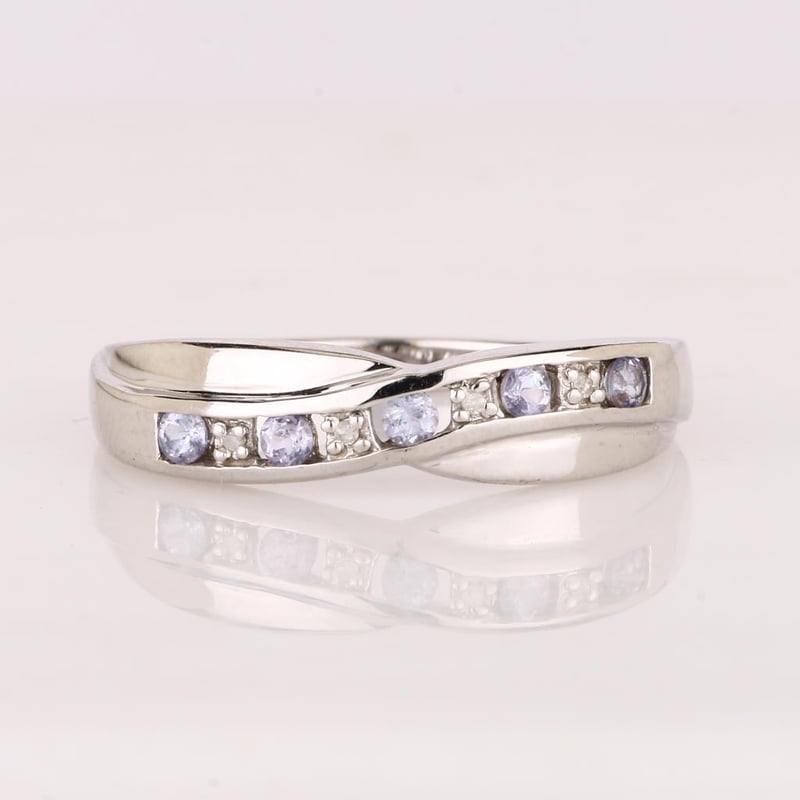 Step into a realm of luxury with this exquisite ring, a harmonious blend of nature's most coveted treasures. At its heart, five perfectly matched round Tanzanite stones, each measuring an impressive 2.10-2.20mm, radiate a captivating hue reminiscent of twilight skies. Their rich violet-blue tones are enhanced by the brilliance of four meticulously set round white diamonds, each 0.90mm in size, which twinkle like stars in the night.