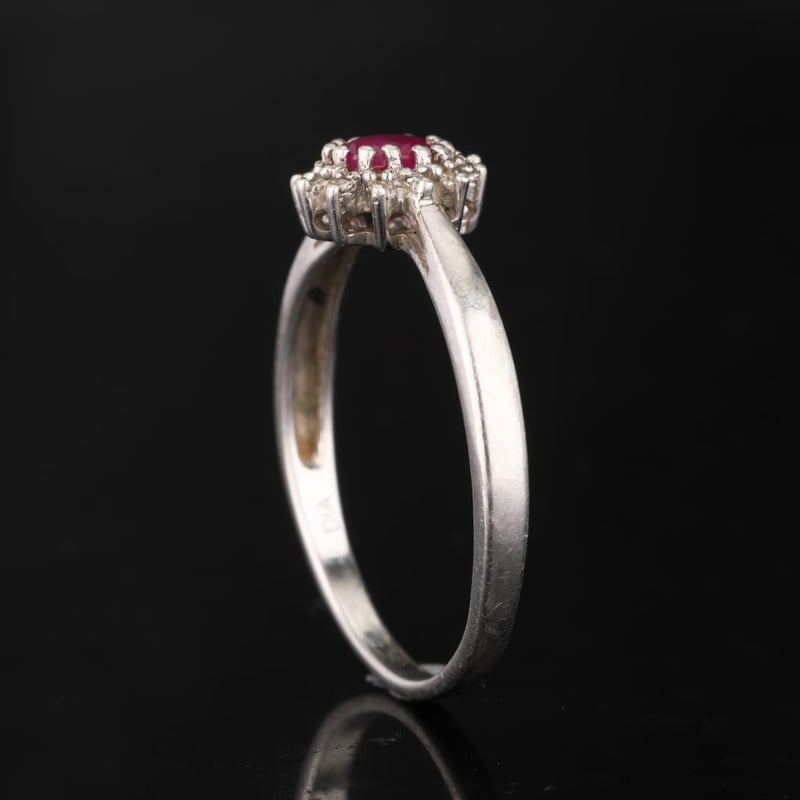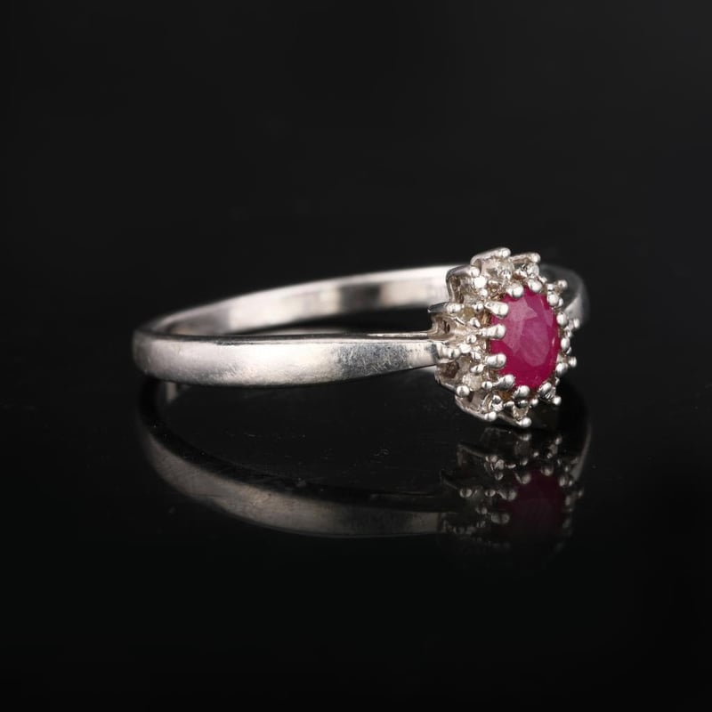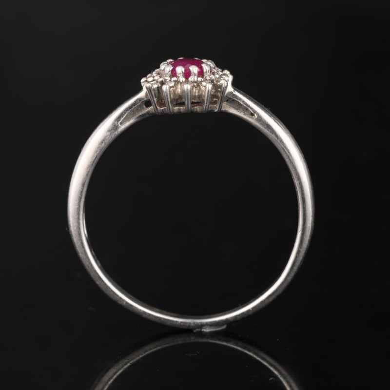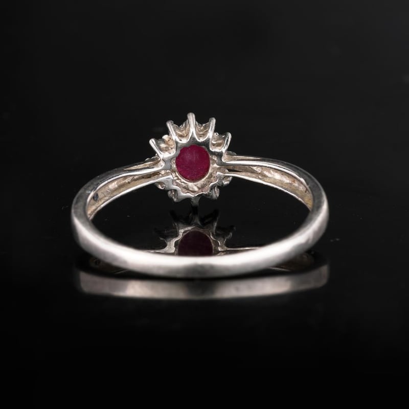 Step into the realm of luxury with this stunning ring featuring a captivating oval Bkk ruby, measuring 5x4mm, nestled among six exquisite round white diamonds, each delicately crafted at 0.90mm. The rich, velvety hue of the ruby radiates an air of passion and elegance, making it the perfect centerpiece for any jewelry collection.