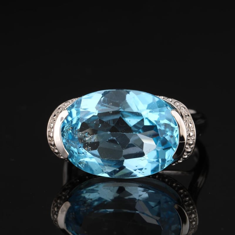 Step into a world of sophistication with this breathtaking Blue Topaz ring, featuring a stunning oval stone measuring 18x13mm. The vibrant blue hue of the topaz, reminiscent of the clearest summer skies, is beautifully set in a polished band that complements its dazzling brilliance.