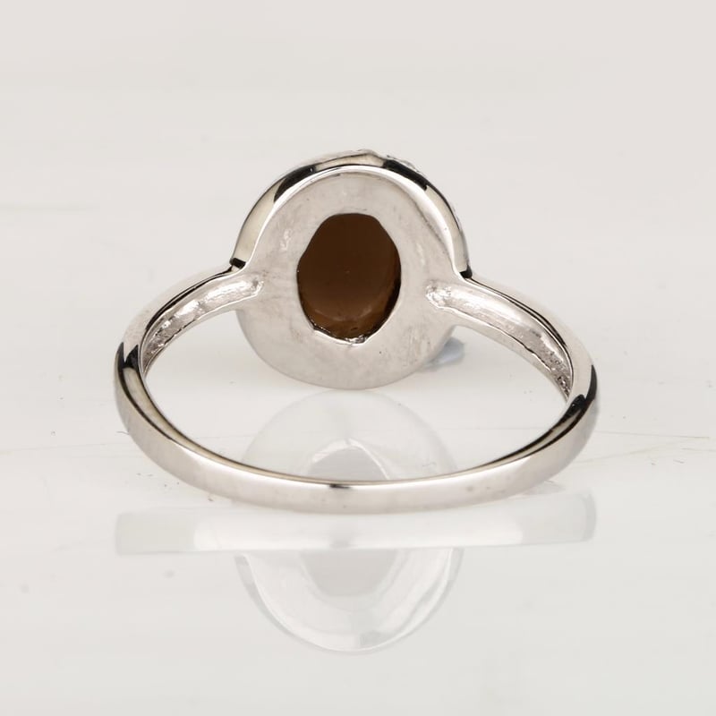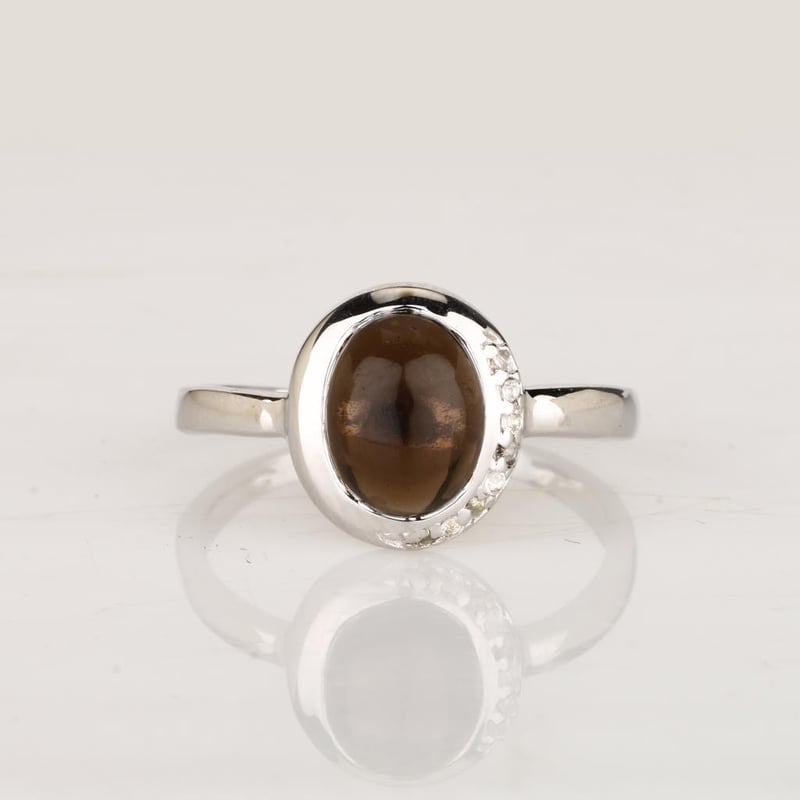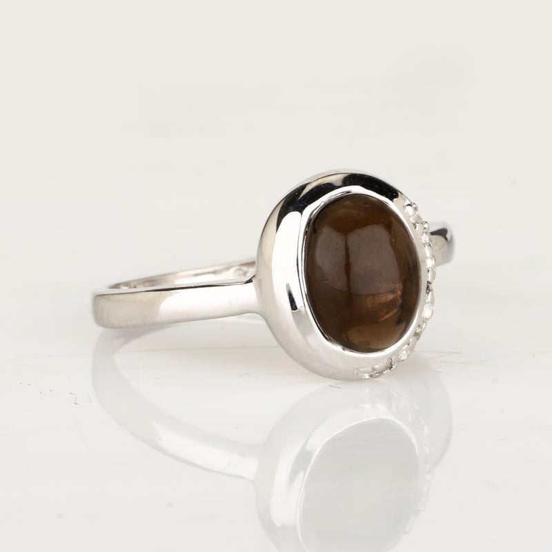 Step into a realm of elegance with this stunning ring, where the deep, enchanting hues of a 9x7mm oval smoky quartz take center stage. This captivating gemstone, renowned for its rich, earthy tones and unique allure, is beautifully complemented by the sparkle of eight round white topaz stones, each measuring 1.10mm.