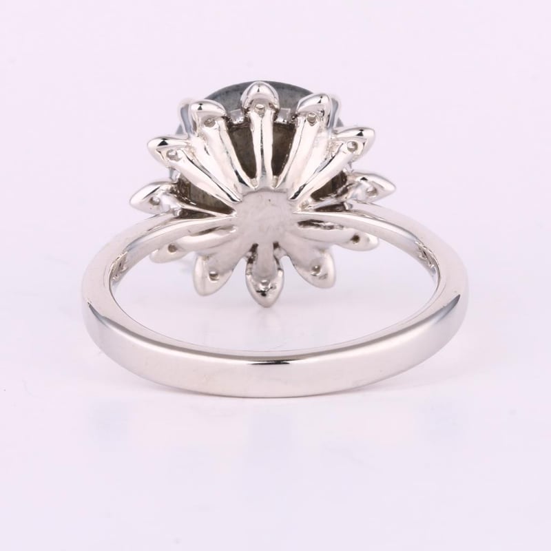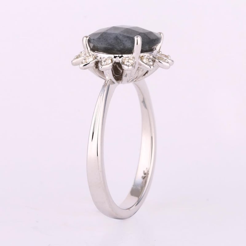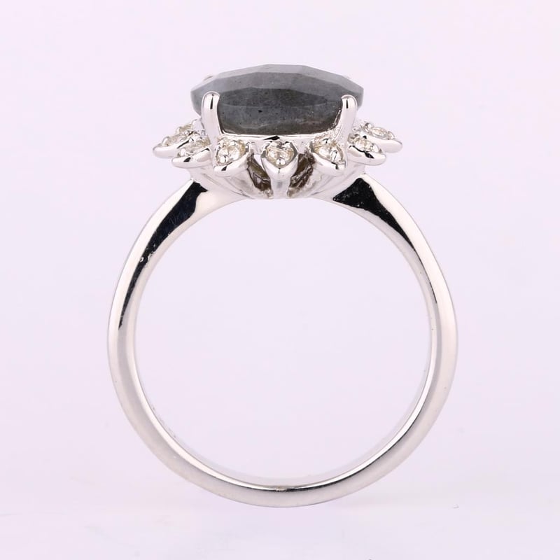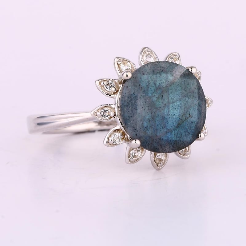 Step into a world of elegance with this breathtaking ring, showcasing a mesmerizing 10.00mm checkerboard round labradorite at its heart. The stone's ethereal play of color dances with hues of blue, green, and silver, capturing the light and transforming every glance into a moment of wonder. Surrounding this captivating centerpiece are twelve stunning round white topaz stones, each measuring 1.20mm, expertly set to enhance the ring's overall brilliance.