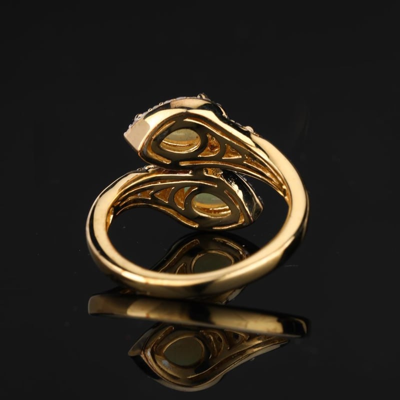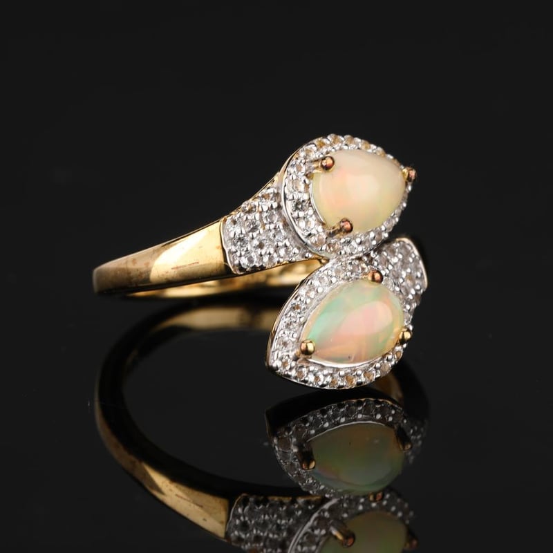 Ethereal Elegance: Ethiopian Opal & White Topaz RingImmerse yourself in the enchanting allure of this exquisite ring, showcasing two captivating Ethiopian opals, each perfectly shaped into pear cuts measuring 7x5mm. The opals, renowned for their mesmerizing play-of-color, radiate a kaleidoscope of shades, reminiscent of a sunlit rainbow captured within a gemstone. Flanking these stunning opals are 62 sparkling round white topaz stones, each measuring 1.00mm, meticulously set to create a luxurious halo that enhances the opals’ brilliance and adds a touch of timeless elegance.The ring is elegantly finished with a lustrous white pen rhodium plating, ensuring a radiant shine that complements the vibrant colors of the gemstones. Designed with sophistication in mind, the J BACK setting not only ensures a secure fit but also elevates the overall aesthetic, making it a statement piece for any occasion.This ring is more than just jewelry; it is a testament to artistry and nature's beauty, destined to be cherished for generations. Embrace the ethereal charm of Ethiopian opal and let this remarkable piece transform your collection.