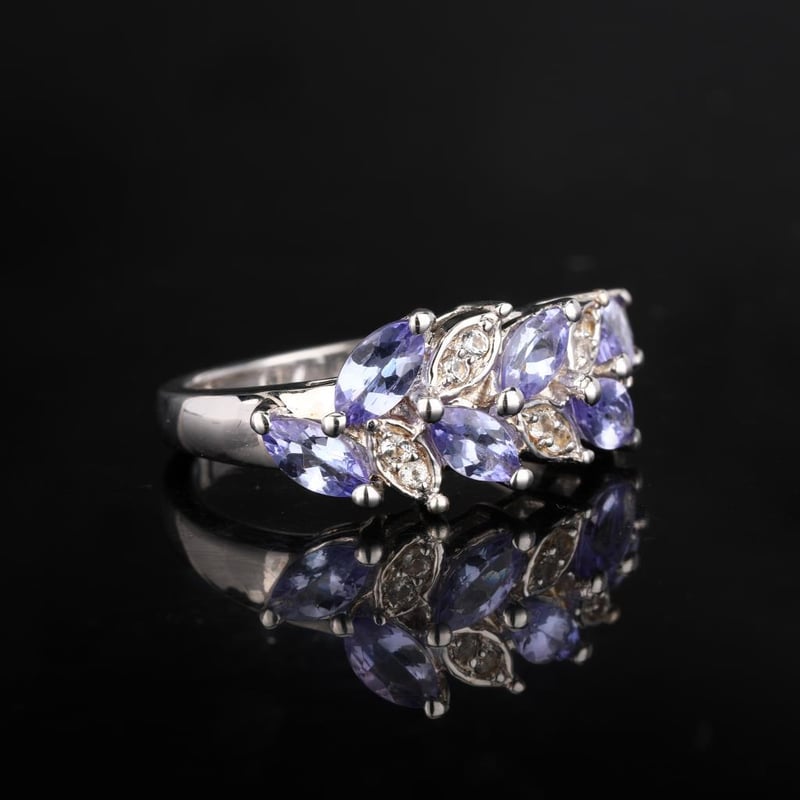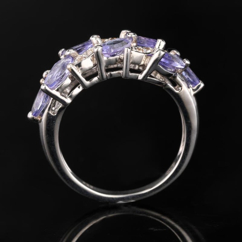 Step into a world of elegance with this exquisite ring, featuring a stunning array of eight oval-cut Tanzanite stones, each measuring 4x3mm. Resplendent in their deep violet-blue hues, these AA-grade gems evoke the beauty of twilight skies and the mysteries of the cosmos. Complementing the Tanzanites are three dazzling round White Topaz stones, each 1.30mm in size, strategically placed to enhance the radiance of the centerpiece stones.