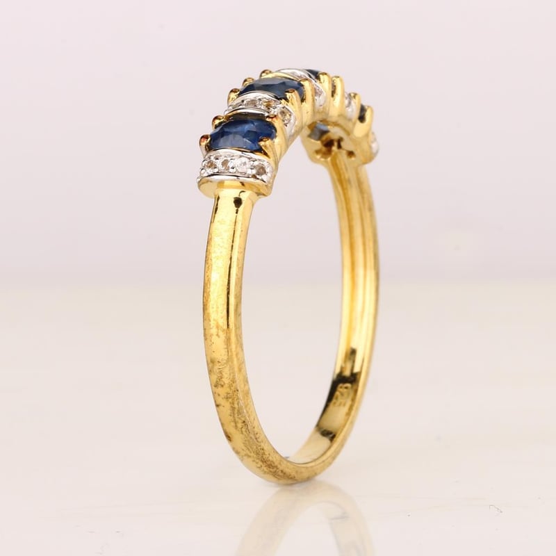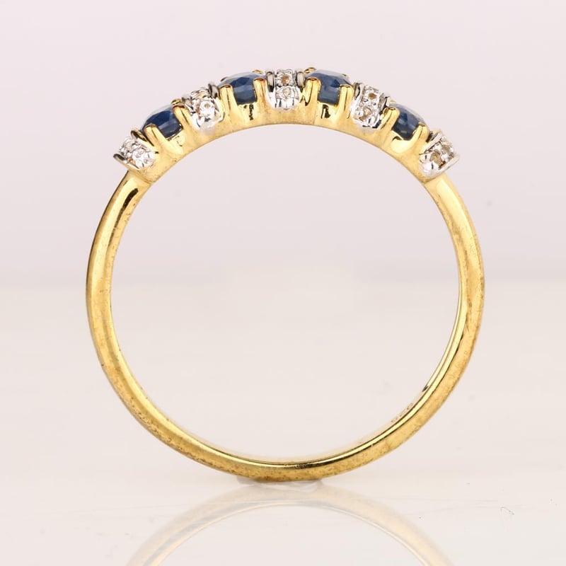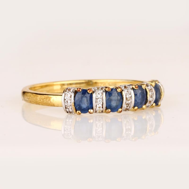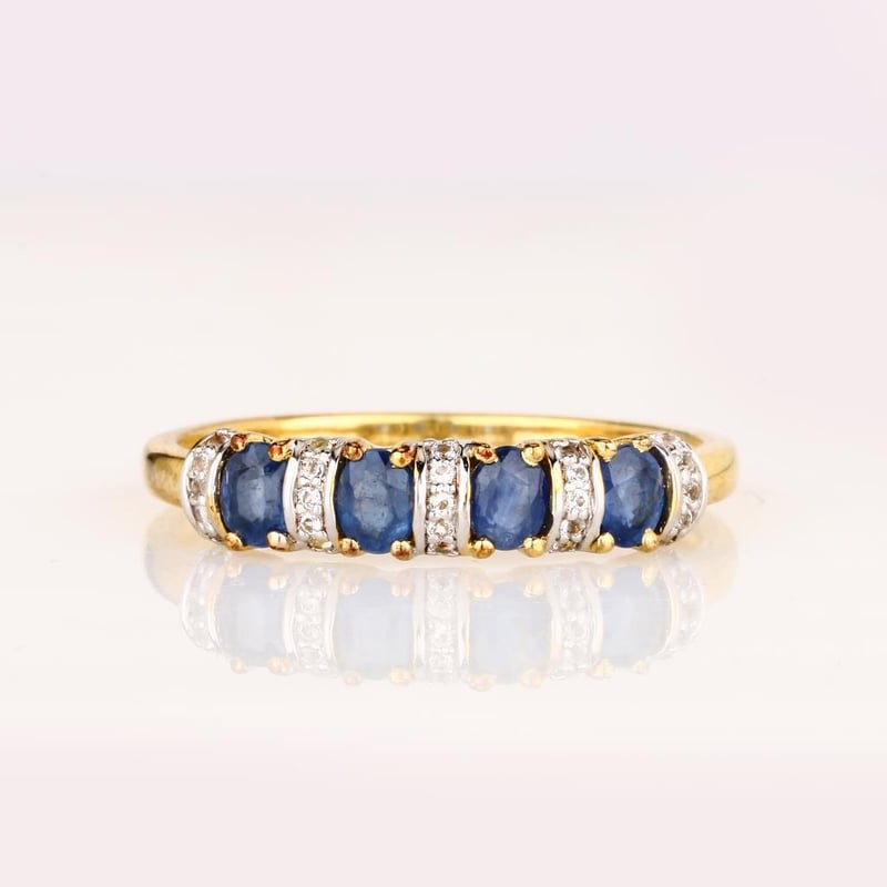 Indulge in the exquisite charm of this captivating ring, where the deep azure allure of four oval blue sapphires (4x3mm) takes center stage. Each sapphire, a testament to nature’s artistry, is meticulously set to create a striking contrast against the radiant brilliance of twenty-five round white topaz stones (0.90mm). This harmonious blend of rich blue and shimmering white is further enhanced by a luxurious white pen rhodium finish, ensuring a lustrous sheen that elegantly catches the light from every angle.