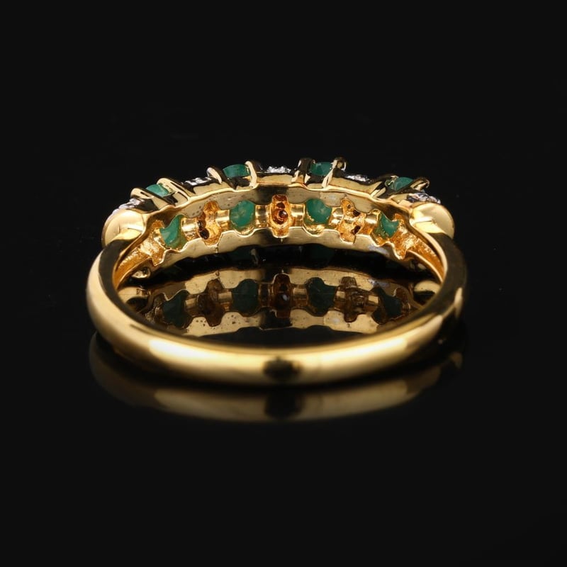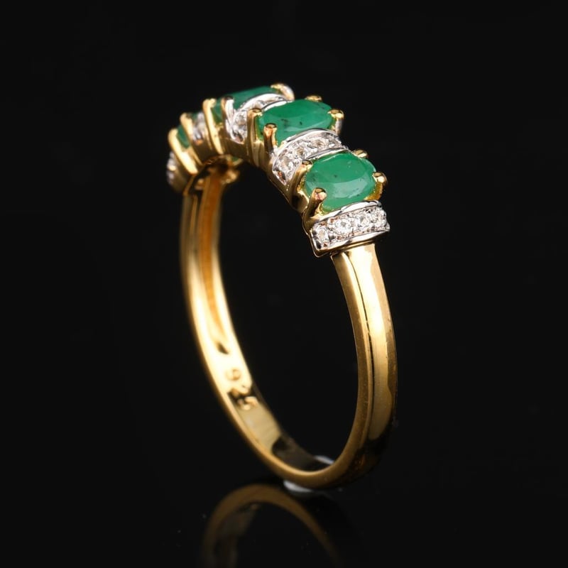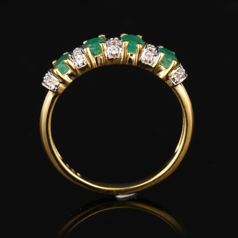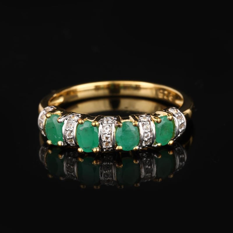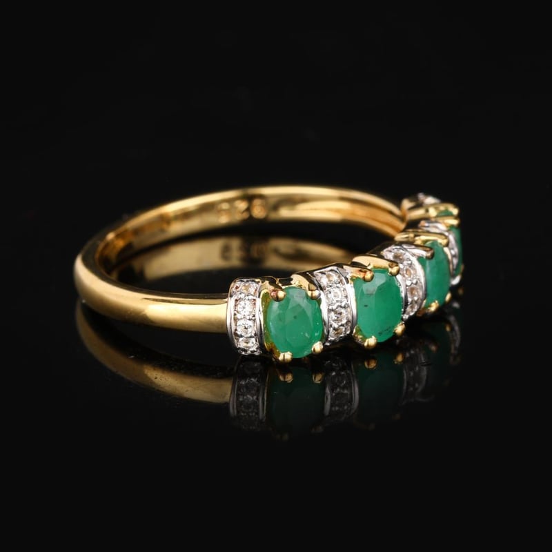 Embrace the allure of elegance with this exquisite ring featuring four lustrous Sakota emeralds, each an enchanting oval measuring 4x3mm. The vibrant green hues of these ethically sourced gemstones radiate a sense of sophistication and vitality, evoking the serene beauty of nature itself. Complementing the emeralds are twenty-five shimmering round white topaz stones, each 0.90mm in size, meticulously set to enhance the brilliance and allure of the design.