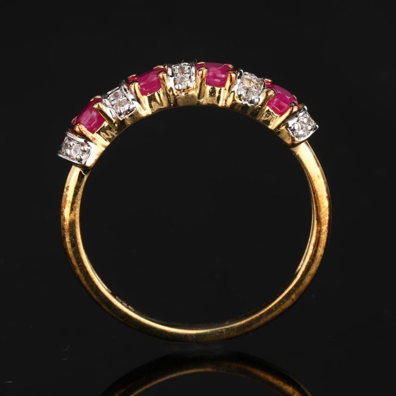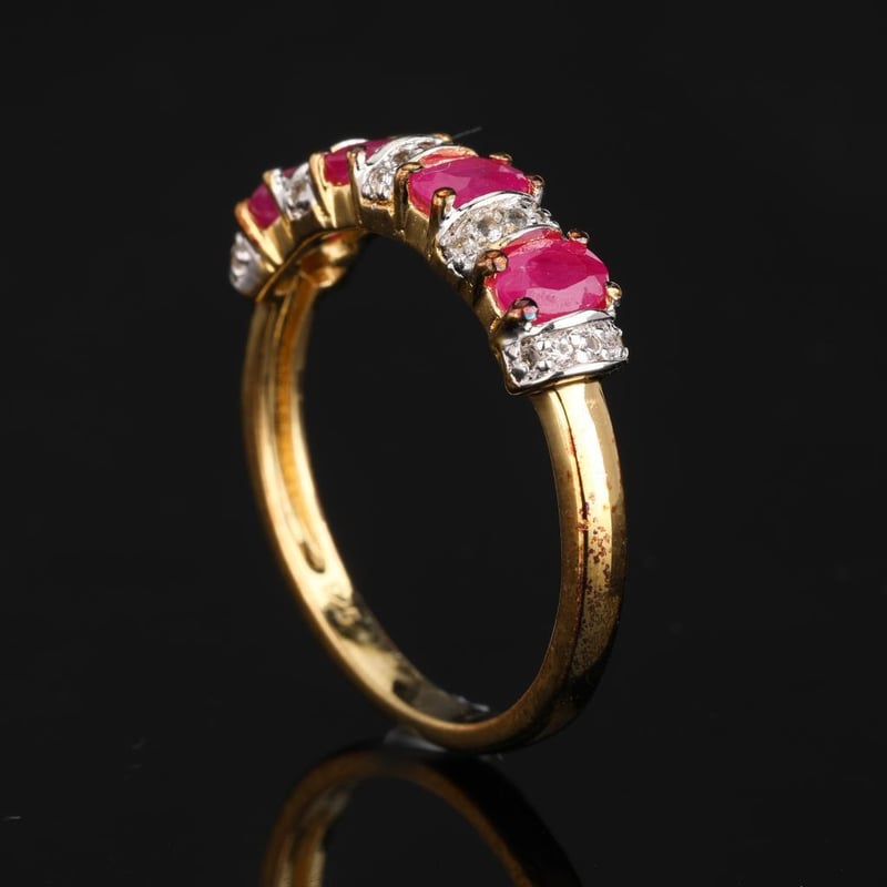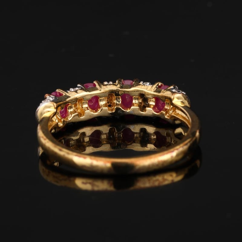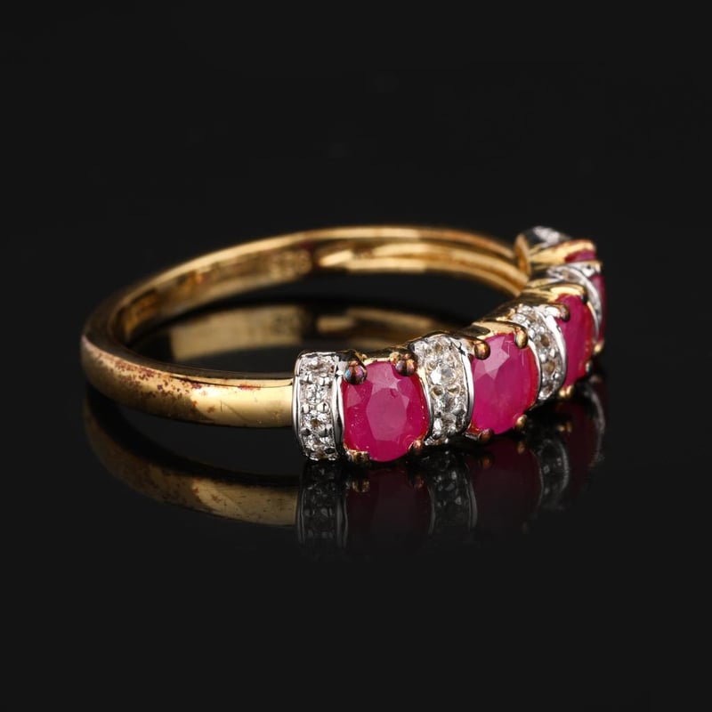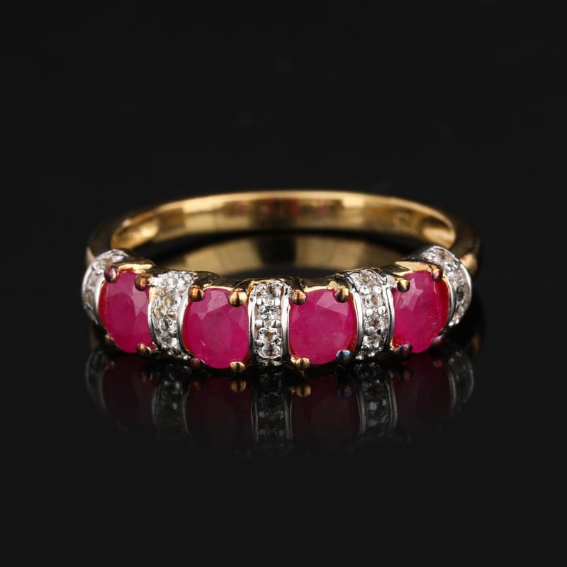 Prepare to be captivated by this stunning ring, featuring four lustrous oval Bkk rubies, each measuring 4x3mm, elegantly set amidst a sparkling halo of twenty-five radiant white topaz stones, each 0.90mm in size. The rich, velvety red of the rubies contrasts beautifully with the shimmering brilliance of the topaz, creating a piece that is both luxurious and enchanting.
