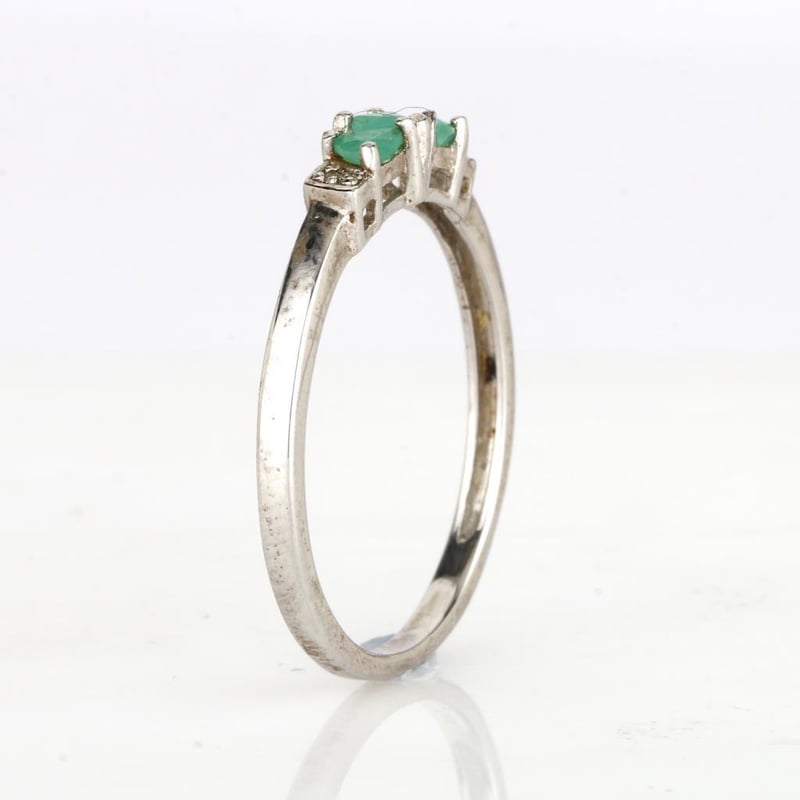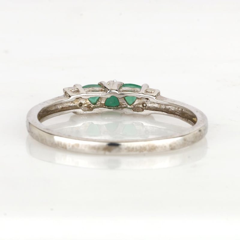 Adorning the emeralds are four meticulously set round white diamonds, each measuring 0.90mm, adding a sparkling contrast that enhances the overall brilliance of the design. Crafted with precision, this ring is devoid of any white spots or imperfections, ensuring a flawless finish that speaks to the quality and craftsmanship behind every detail.