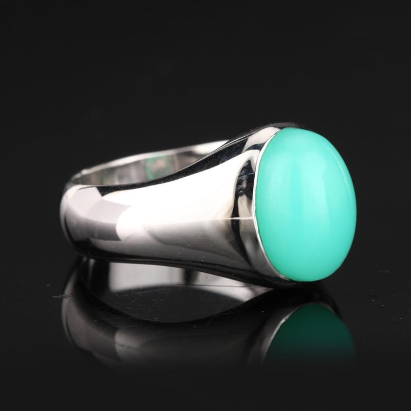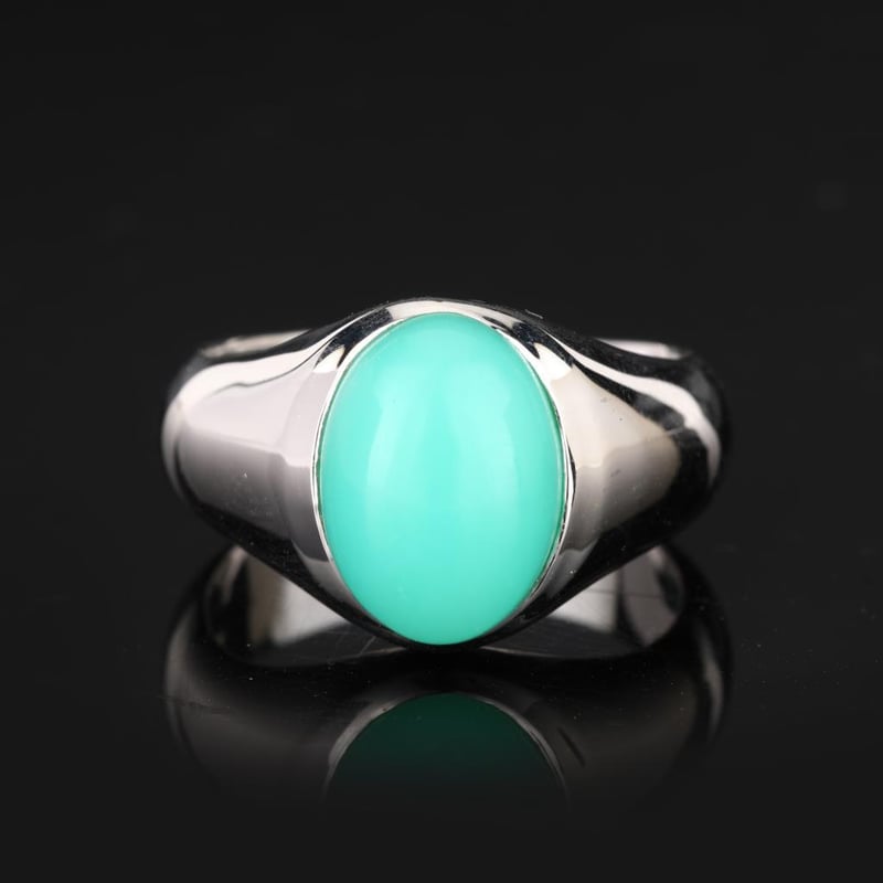 Indulge in the enchanting allure of this stunning ring featuring a premium quality oval cabochon chrysoprase, measuring an impressive 14x10mm. The captivating green hues of this natural gemstone evoke the serene beauty of lush landscapes, offering a sophisticated yet vibrant touch to any jewelry collection.