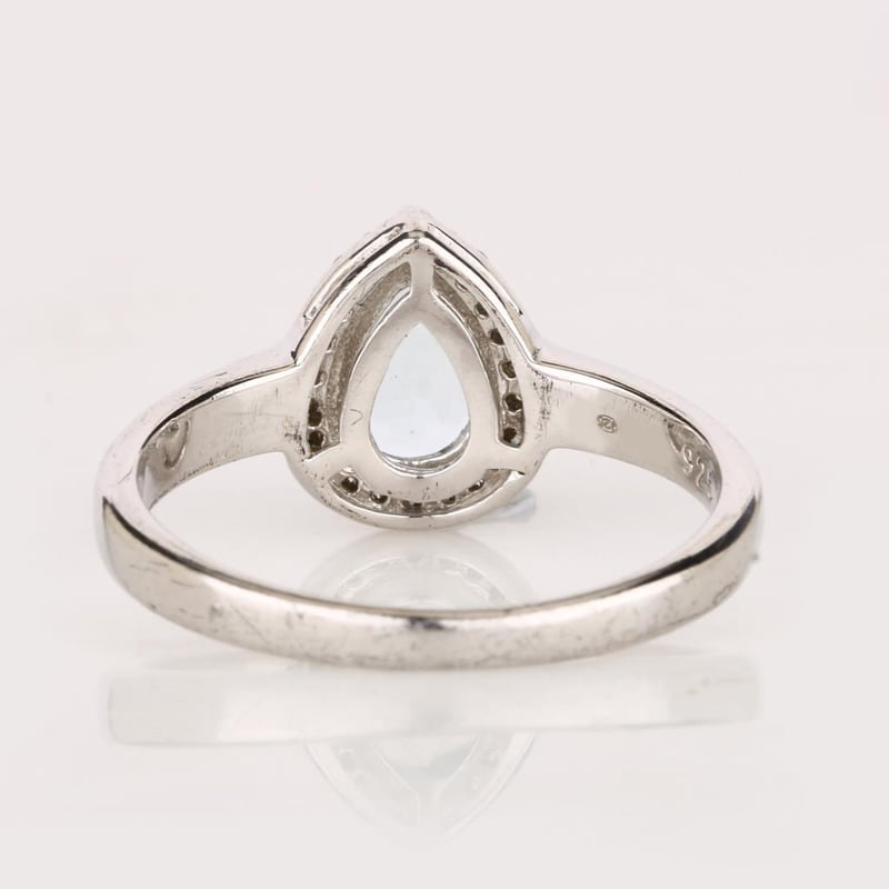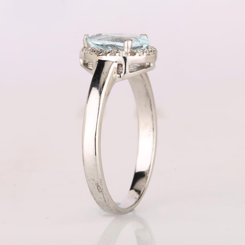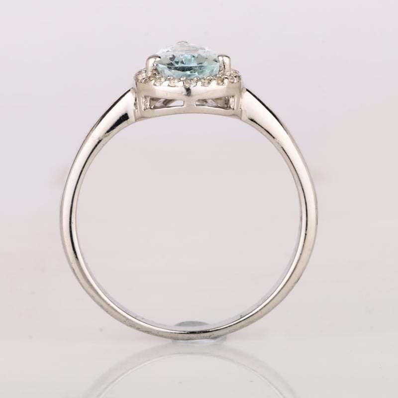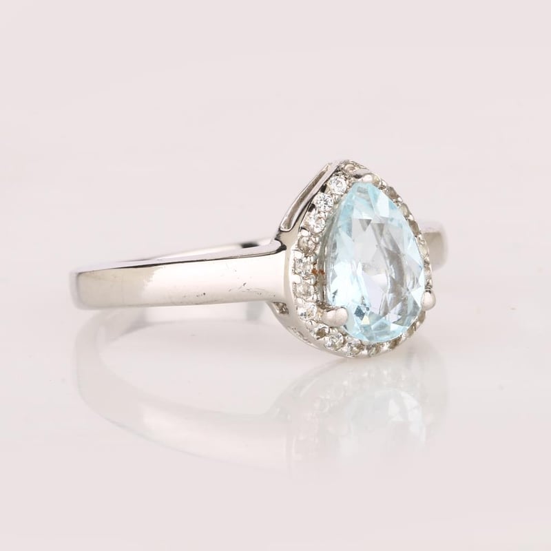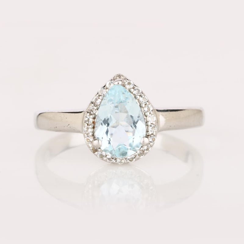 Adorn your hand with an exquisite piece that embodies the serene beauty of the ocean – this breathtaking ring features a stunning 9x6mm AA quality aquamarine pear, radiating a tranquil blue hue that captivates the spirit. The aquamarine is elegantly surrounded by a dazzling array of 24 sparkling round white topaz stones, each measuring 1.10mm, creating a halo of brilliance that enhances the center stone's ethereal charm.