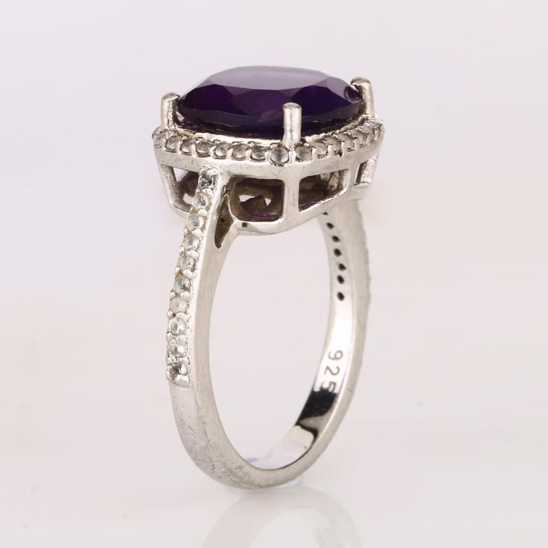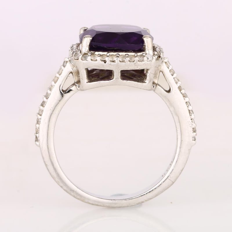 Step into a world of elegance and sophistication with this exquisite ring, featuring a stunning 10.00mm cushion-cut African Amethyst at its heart. This regal gemstone, renowned for its deep violet hue, captivates the eye and enchants the soul, embodying the very essence of luxury. Surrounding this magnificent centerpiece are 53 radiant round white topaz stones, each measuring 1.10mm, meticulously set to enhance the amethyst’s brilliance and create an aura of ethereal beauty.