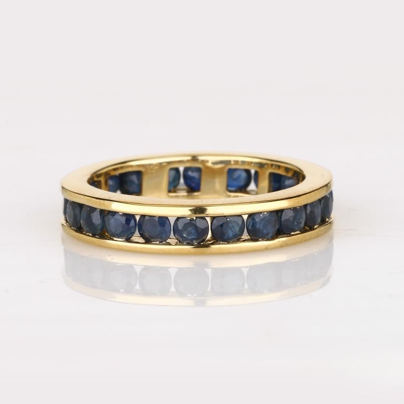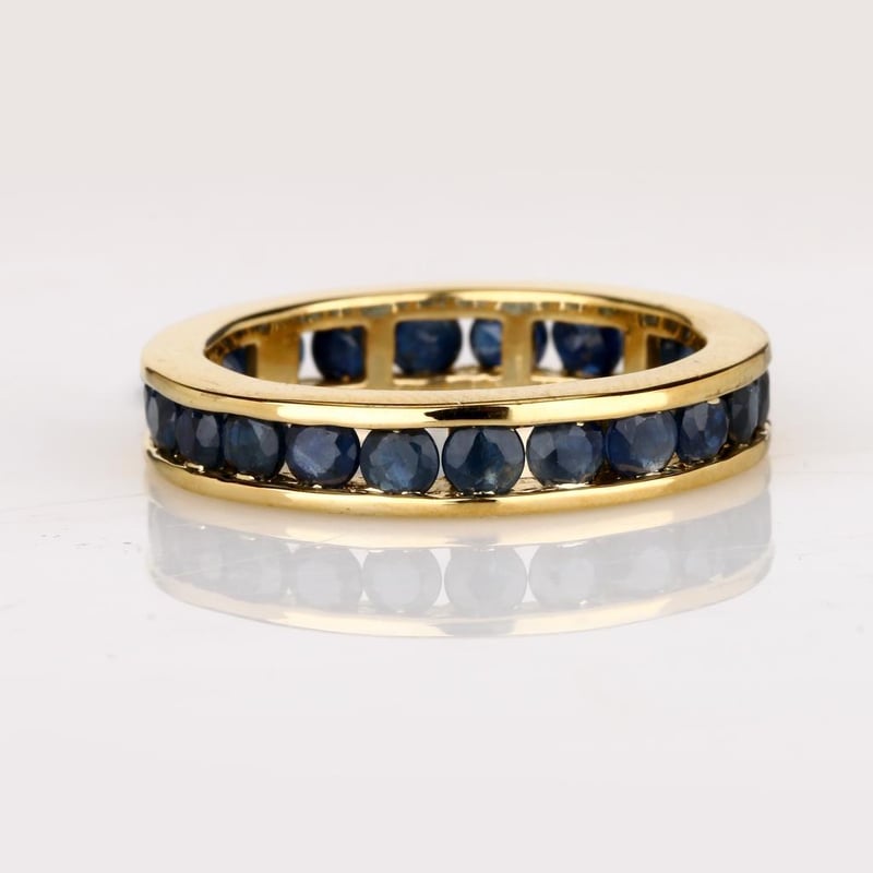 Indulge in the timeless elegance of this magnificent ring, showcasing 22 round blue sapphires, each meticulously set to create a dazzling display of color and brilliance. With a total gemstone weight of 3.00mm, these sapphires radiate a deep, rich hue that captivates the eye and enchants the soul. The ring's band, measuring a substantial 5.00mm in width, offers a comfortable yet striking presence on the finger, making it the perfect accessory for both everyday wear and special occasions.