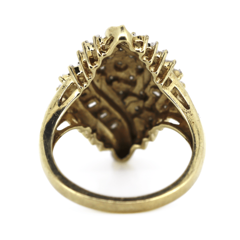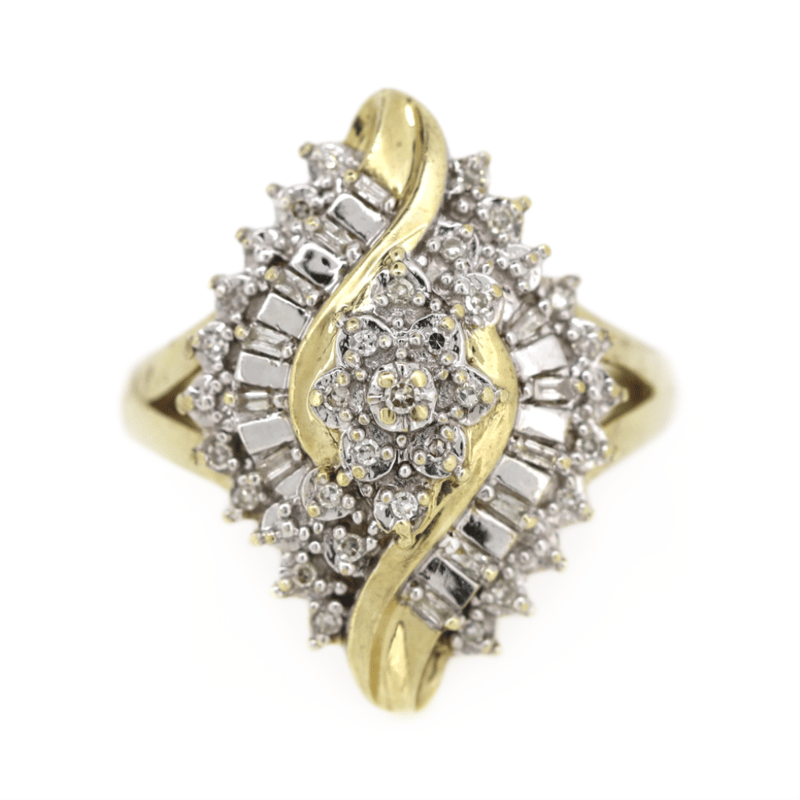 9K YELLOW GOLD/RHODIUM AND DIAMOND, ORNATE STATEMENT RING.