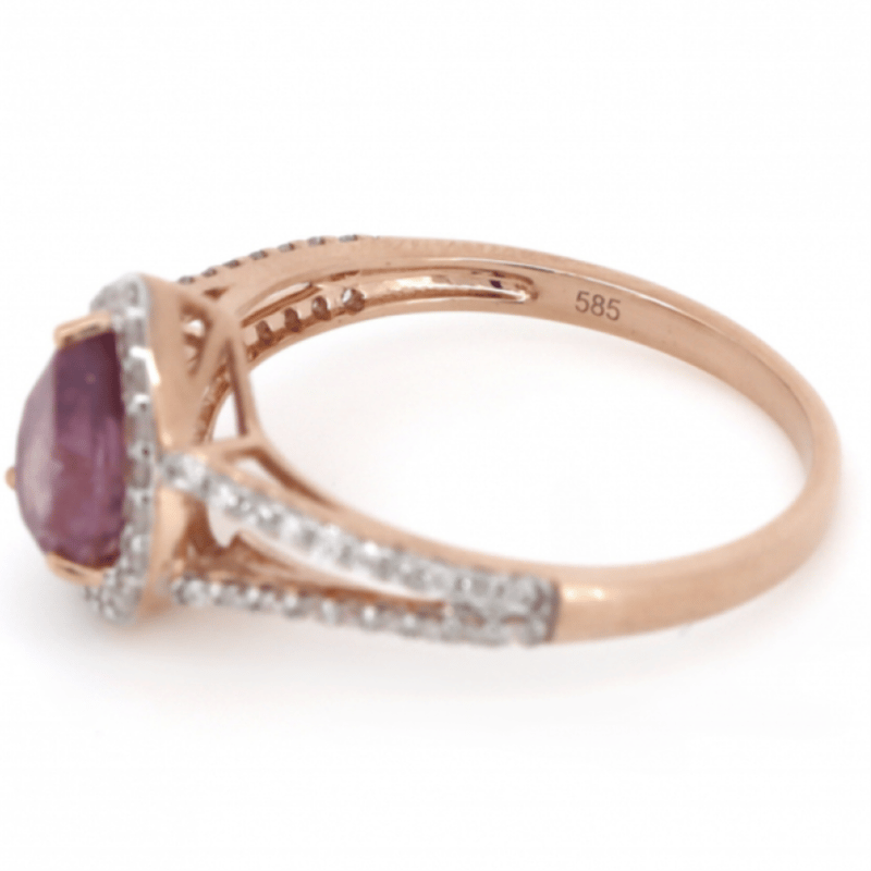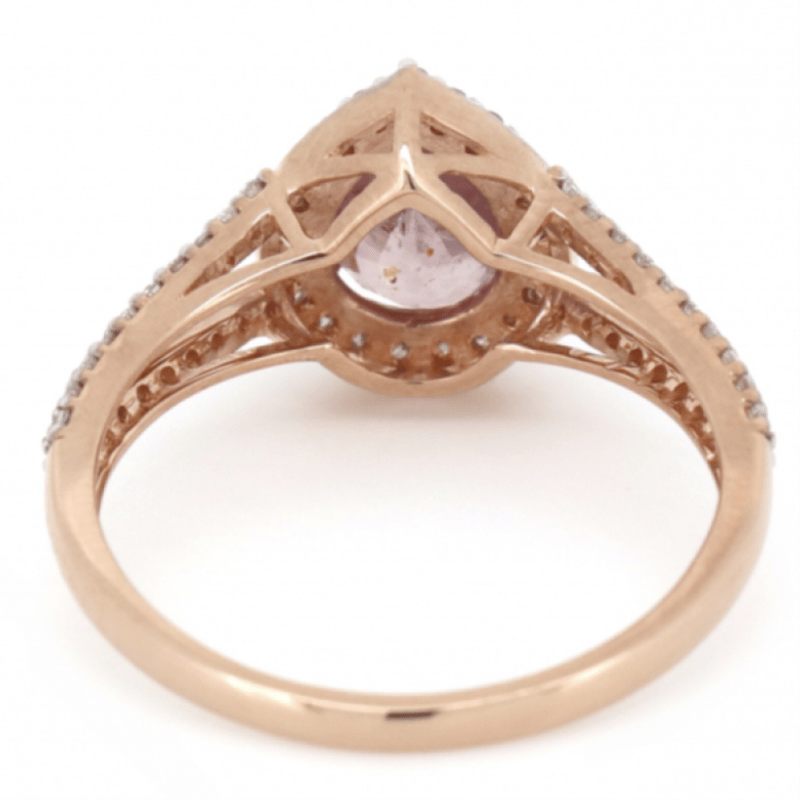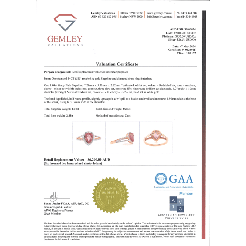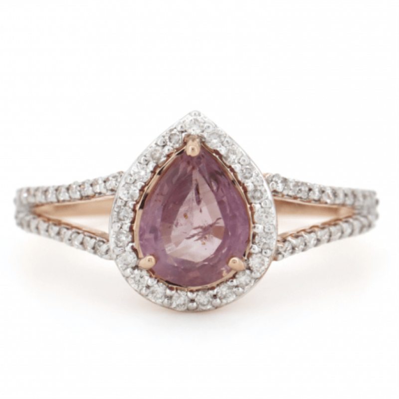 14K ROSE GOLD, PINK SAPPHIRE AND DIAMOND, HALO SPLIT BAND RING. The Centre Features, One Pear Cut, Medium Reddish-Pink, Sapphire (1.04Ct, Minor Eye Visible Inclusions), 3 Claw Set. Surrounding The Centre In A Halo And Decorating The Split Band Are, 59 Round Brilliant Cut, Diamonds (0.27Ct Tdw, J-K Colour, Si2-I2 Clarity), Bead Set In White Gold. Ring Size M. Valuations Provided by an Independent Third-Party Professional Not Directly Associated With Lloyds Auctions at AUD $$6,290.00This valuation has been conducted by an independent third-party professional. The valuation amount is an assessment by the issuing valuer and does not reflect the auction value of the item. Any inquiries regarding the valuation should be directed to the issuing valuer (refer to contact details on the certificate), as Lloyds Auctions has no affiliation or influence over the valuation, the valuer, or the stated amount. Condition: Good - Refer Images 0645949+1508