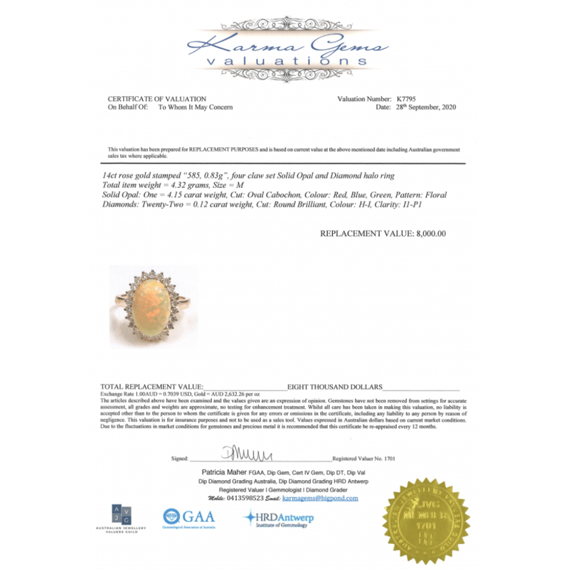 The Centre Features, One Oval Cabochon Cut, Solid Opal (4.15Ct, Red-Blue-Green Colour Display, Floral Pattern), 4 Claw Set. Surrounding The Centre In A Halo Are, 22 Round Brilliant Cut, Diamonds (0.12Ct Tdw, H-I Colour, I1-P1 Clarity), Claw Set. Ring Size M 1/2.