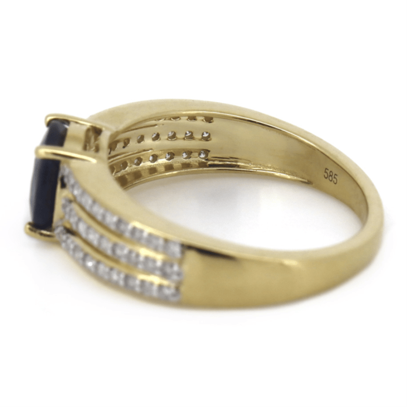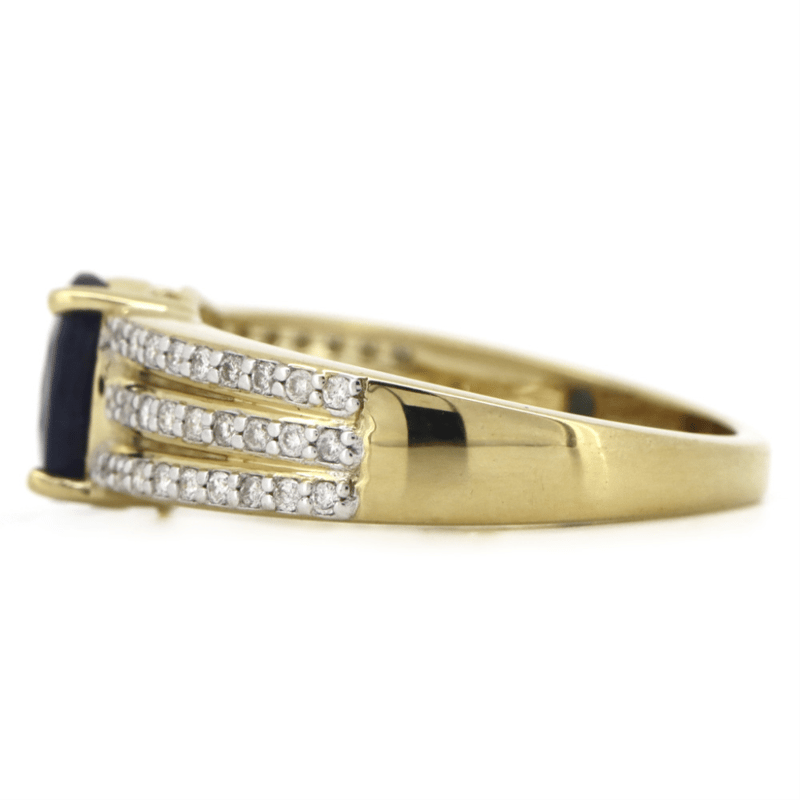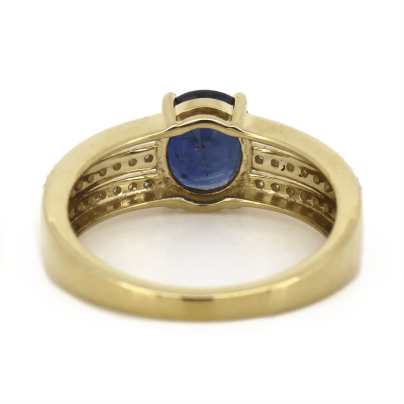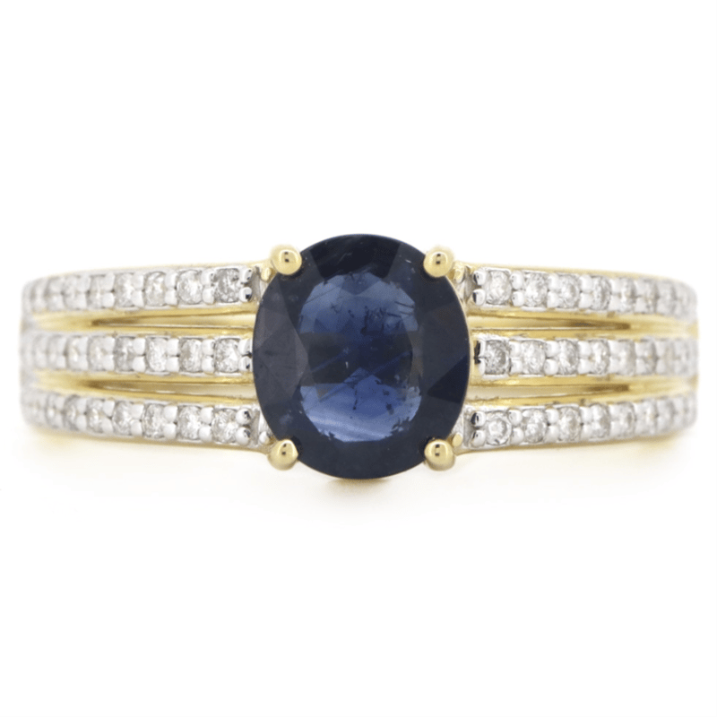 14K YELLOW GOLD, 1.48CT BLUE CEYLON SAPPHIRE AND DIAMOND, DOUBLE SPLIT BAND RING.