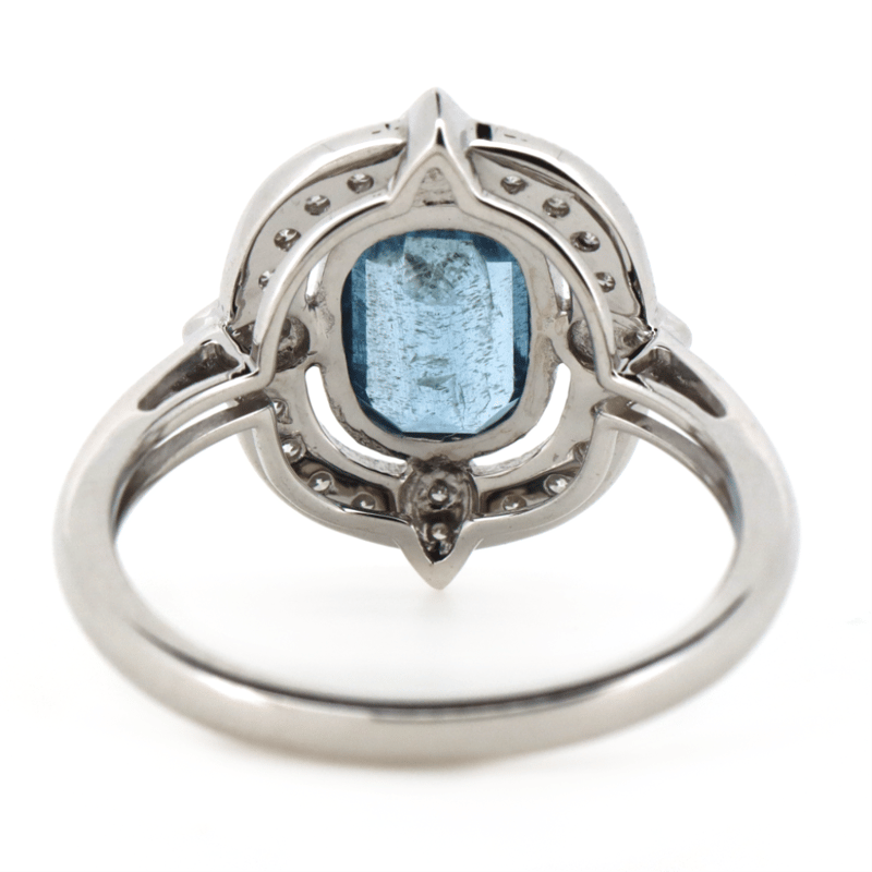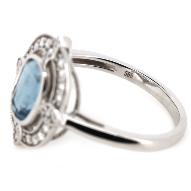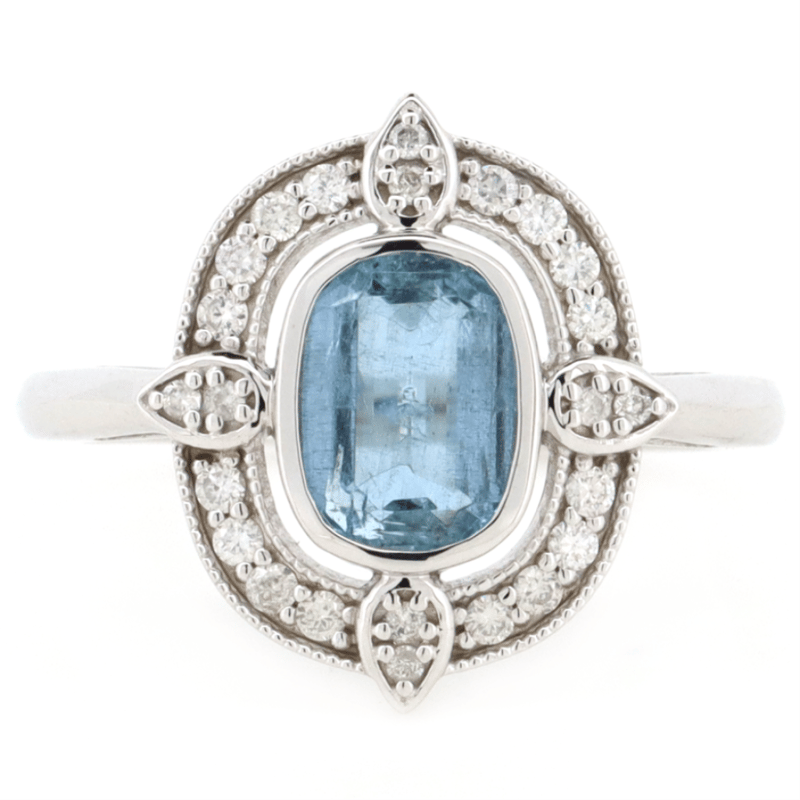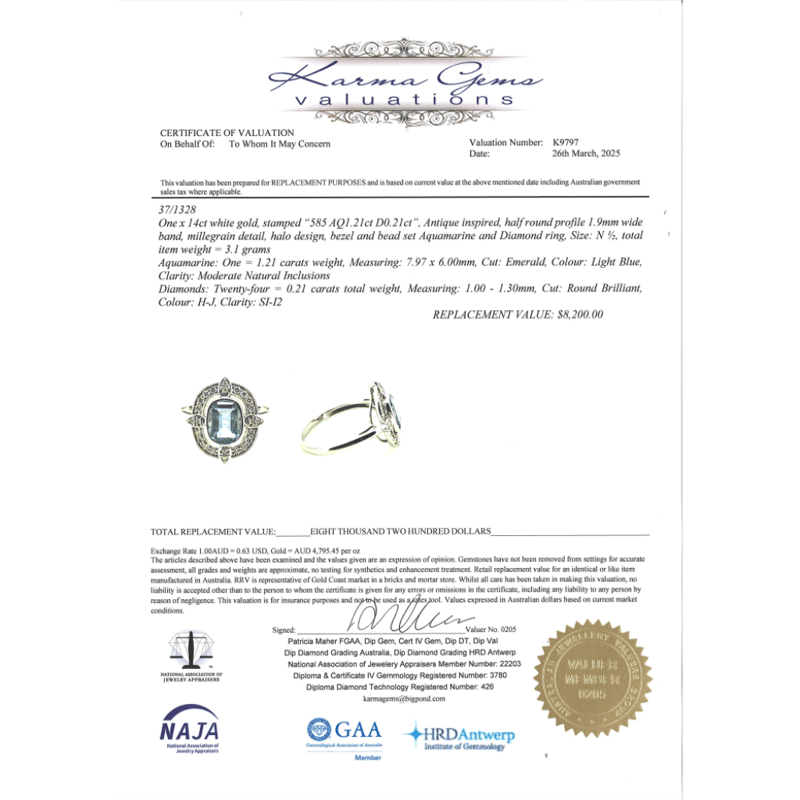 14K WHITE GOLD, AQUAMARINE AND DIAMOND, HALO RING. The Centre Features, One Emerald Cut, Light Blue, Aquamarine (1.21Ct, Moderate Natural Inclusions), Bezel Set. Encompassing The Centre Are, 24 Round Brilliant Cut, Diamonds (0.21Ct Tdw, H-J Colour, Si-I2 Clarity), Bead Set. Ring Size N. Valuations Provided by an Independent Third-Party Professional Not Directly Associated With Lloyds Auctions at AUD $$8,200.00This valuation has been conducted by an independent third-party professional. The valuation amount is an assessment by the issuing valuer and does not reflect the auction value of the item. Any inquiries regarding the valuation should be directed to the issuing valuer (refer to contact details on the certificate), as Lloyds Auctions has no affiliation or influence over the valuation, the valuer, or the stated amount. Condition: Good - Refer Images 0645949+1517