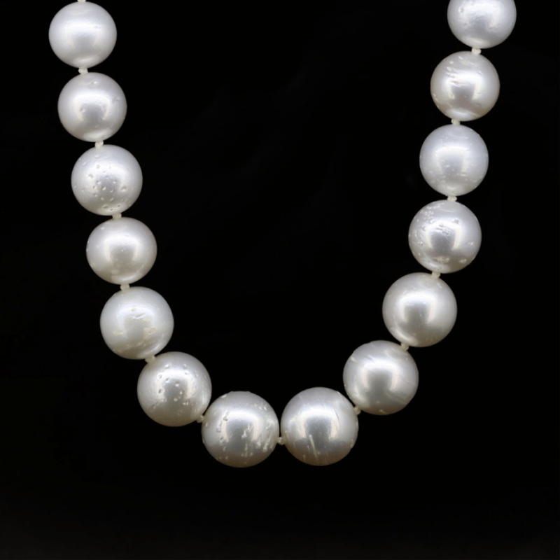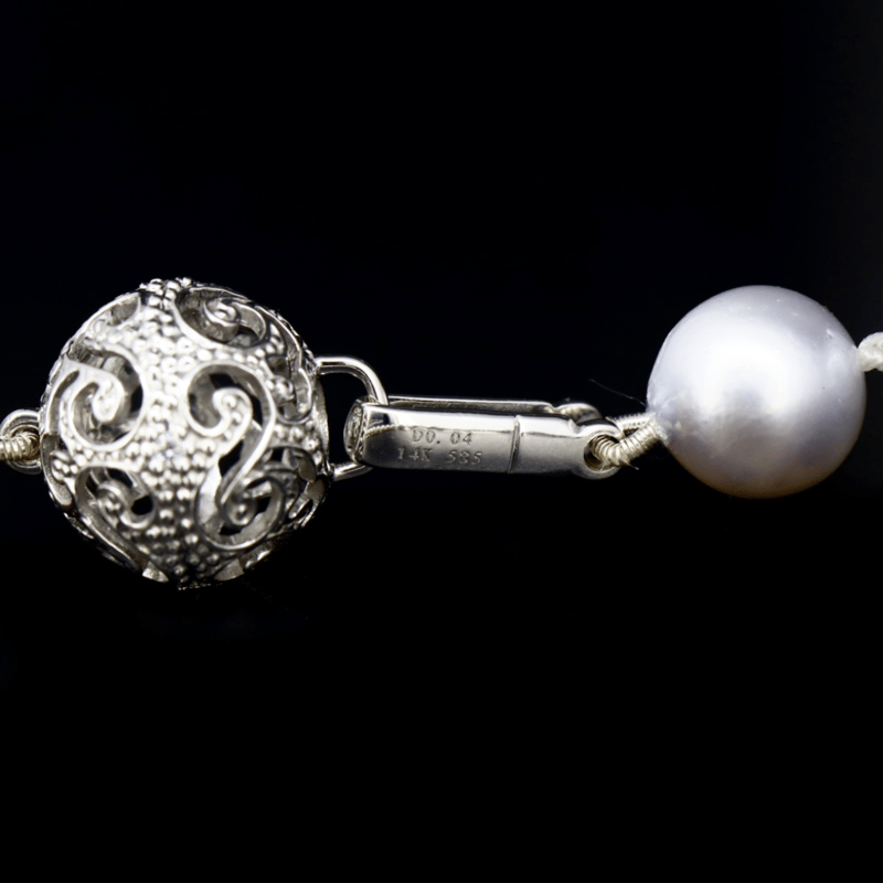 The Design Features, 39 Near Round, White With Silver, Pink, Green And Bronze Overtones, Cultured South Sea Pearls (9.00Mm - 13.00Mm Size, Lustre, Slightly Blemished). Embellishing The 14K White Gold, Filigree Ball Clasp Are, 4 Round Brilliant Cut, Diamonds (0.04Ct Tdw, I-J Colour, Si1-P2 Clarity), Bead Set. Necklace Length Is 44Cm.