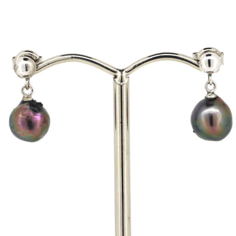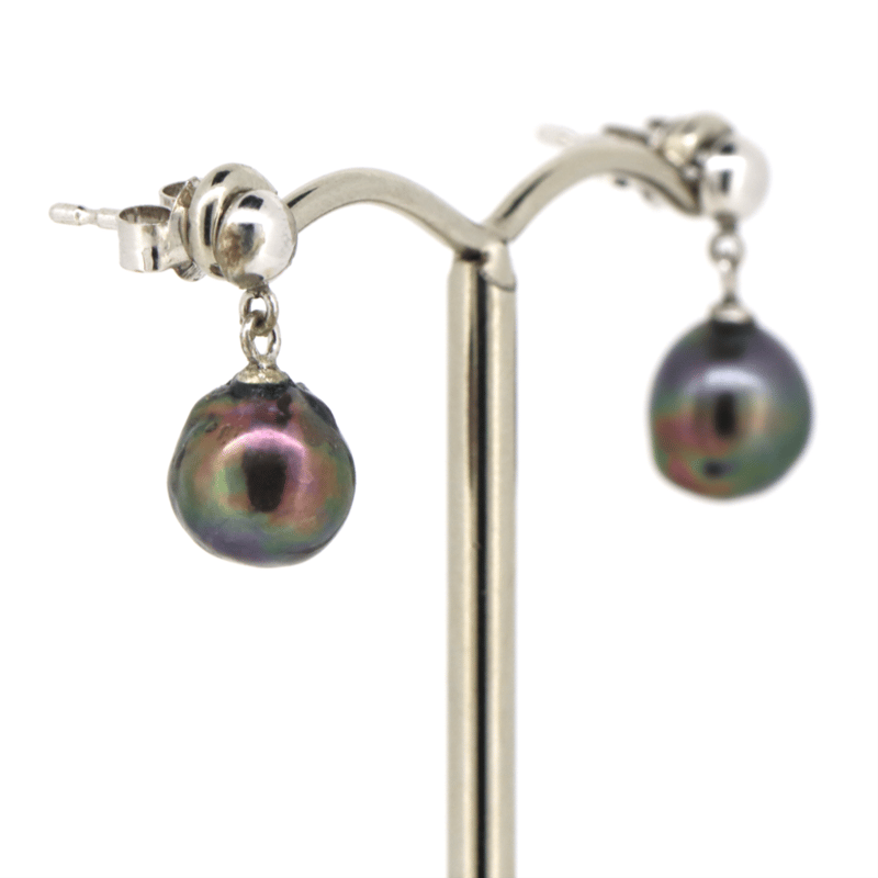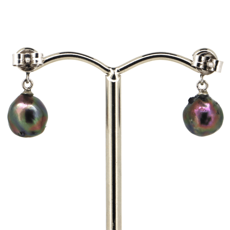 14K WHITE GOLD AND BLACK PEARL, DROP EARRINGS.
