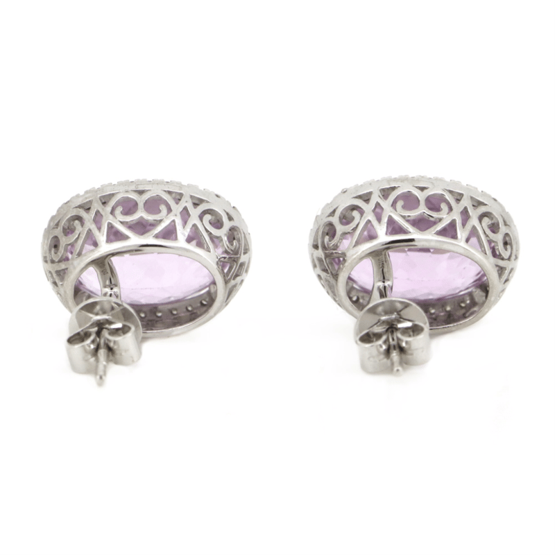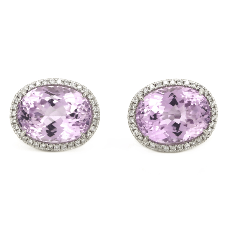 The Centres Feature, 2 Oval Cut, Pinkish-Purple, Kunzites (10.81Ct Tsw, Very Minor Eye Visible Inclusions), 4 Claw Set. Surrounding The Centres In Halos Are, 68 Round Brilliant Cut, Diamonds (0.24Ct Tdw, J-K Colour, Si2-I2 Clarity), Micro-Claw Set. The Earrings Have Post Backs, With 14K White Gold Butterfly Clasps.