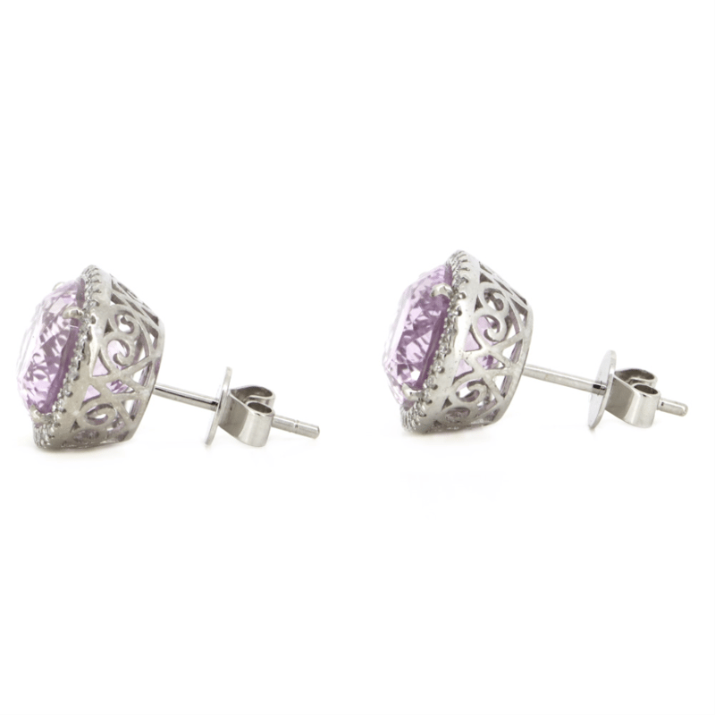 14K WHITE GOLD, KUNZITE AND DIAMOND, HALO STUD EARRINGS.