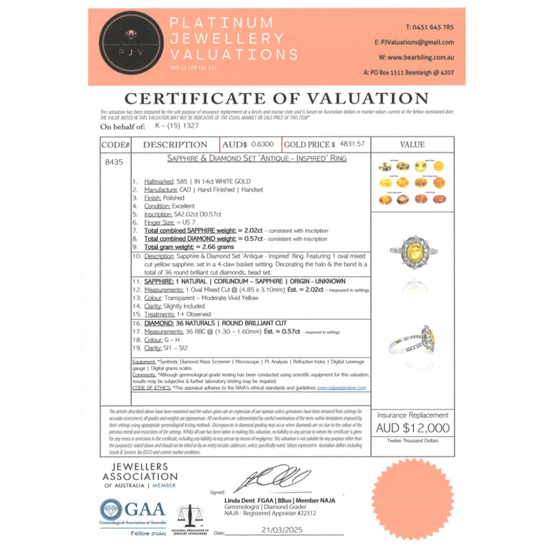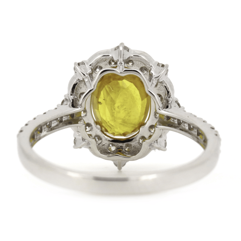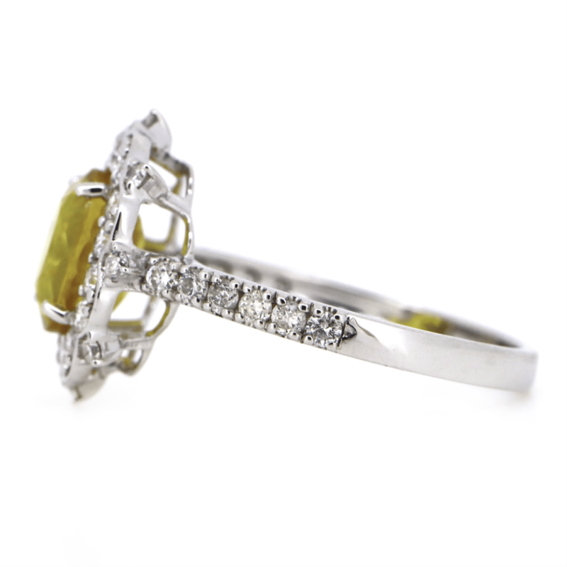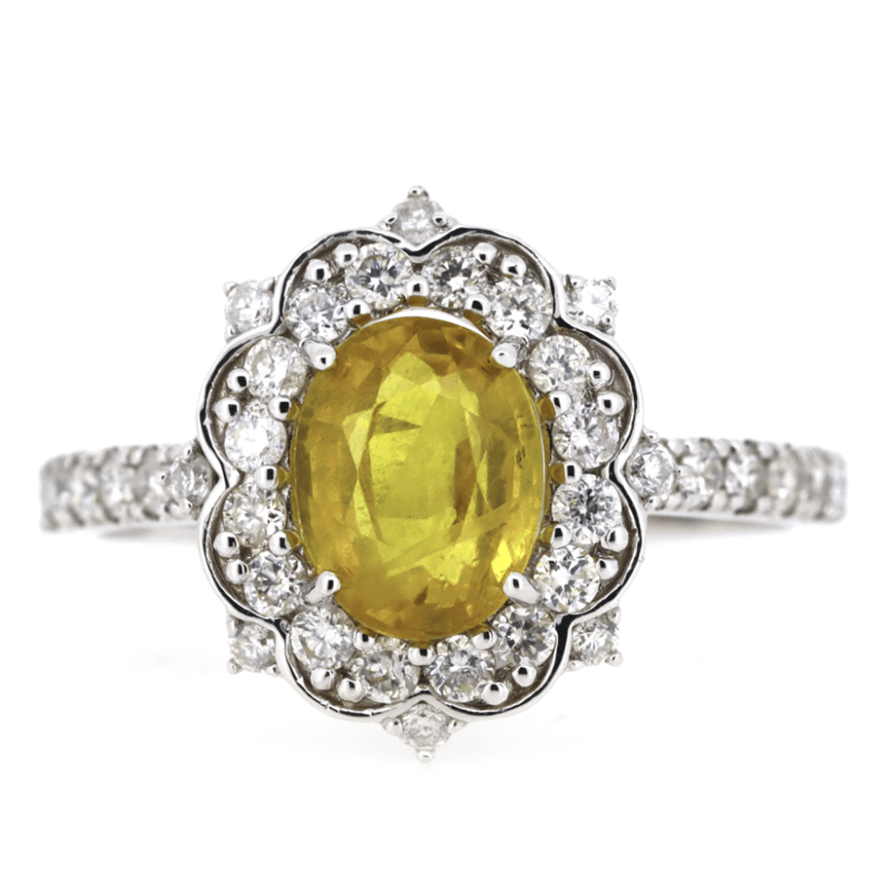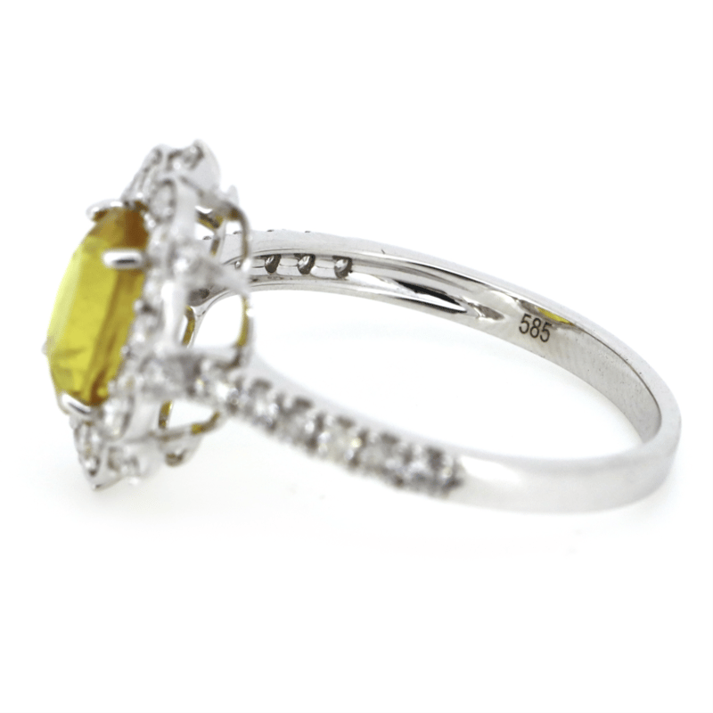 14K WHITE GOLD, YELLOW SAPPHIRE AND DIAMOND, HALO RING. The Centre Features, One Oval Cut, Moderate Vivid Yellow, Sapphire (2.02Ct, Slightly Included, Enhanced), Claw Set. Decorating The Halo And The Band Are, 36 Round Brilliant Cut, Diamonds (0.57Ct Tdw, G-H Colour, Si1-Si2 Clarity), Bead Set. Ring Size N 1/2. Valuations Provided by an Independent Third-Party Professional Not Directly Associated With Lloyds Auctions at AUD $$12,000.00This valuation has been conducted by an independent third-party professional. The valuation amount is an assessment by the issuing valuer and does not reflect the auction value of the item. Any inquiries regarding the valuation should be directed to the issuing valuer (refer to contact details on the certificate), as Lloyds Auctions has no affiliation or influence over the valuation, the valuer, or the stated amount. Condition: Good - Refer Images 0645949+1527