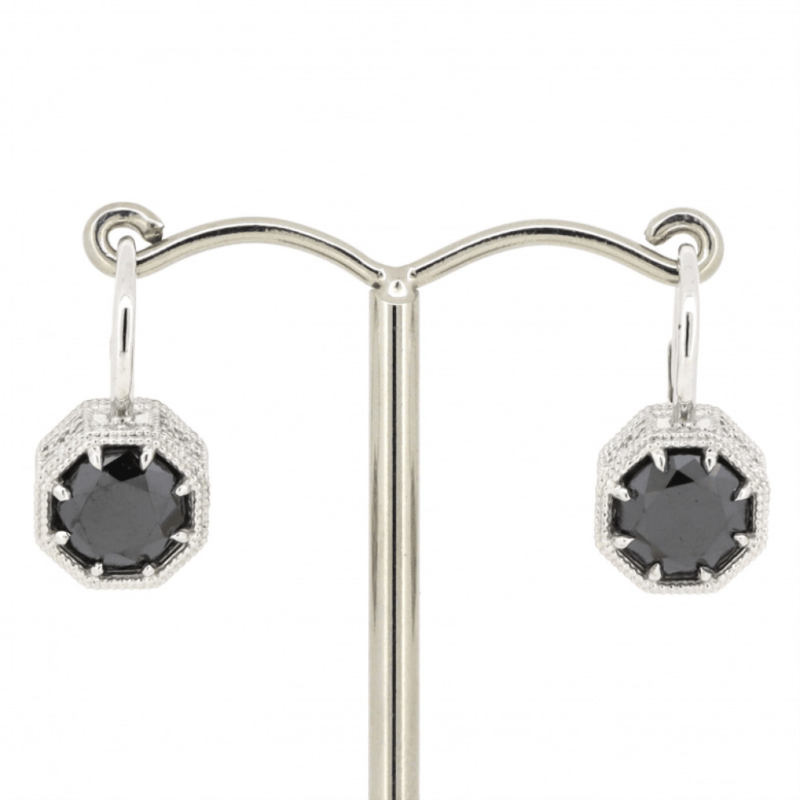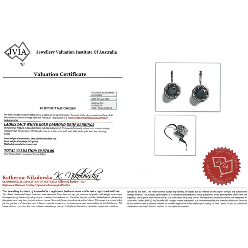 14K WHITE GOLD, BLACK DIAMOND, ANTIQUE INSPIRED DROP EARRINGS. The Drops Feature, 2 Round Brilliant Cut, Black Diamonds (2.76Ct Tdw, Hpht Enhanced), Claw Set. The Earrings Have Lever Back Closures. Valuations Provided by an Independent Third-Party Professional Not Directly Associated With Lloyds Auctions at AUD $$9,870.00This valuation has been conducted by an independent third-party professional. The valuation amount is an assessment by the issuing valuer and does not reflect the auction value of the item. Any inquiries regarding the valuation should be directed to the issuing valuer (refer to contact details on the certificate), as Lloyds Auctions has no affiliation or influence over the valuation, the valuer, or the stated amount. Condition: Good - Refer Images 0645949+1538