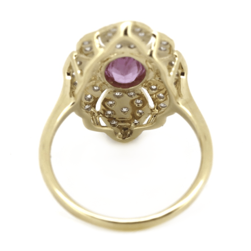 The Centre Features, One Oval Cut, Light Vivid Pink, Sapphire (0.71Ct, Slightly Included With Natural Inclusions), Bezel Set. Encompassing The Stone Are, 44 Round Brilliant Cut, Diamonds (0.45Ct Tdw, H-I Colour, P1-P2 Clarity), Bead Set. Ring Size L 1/2.