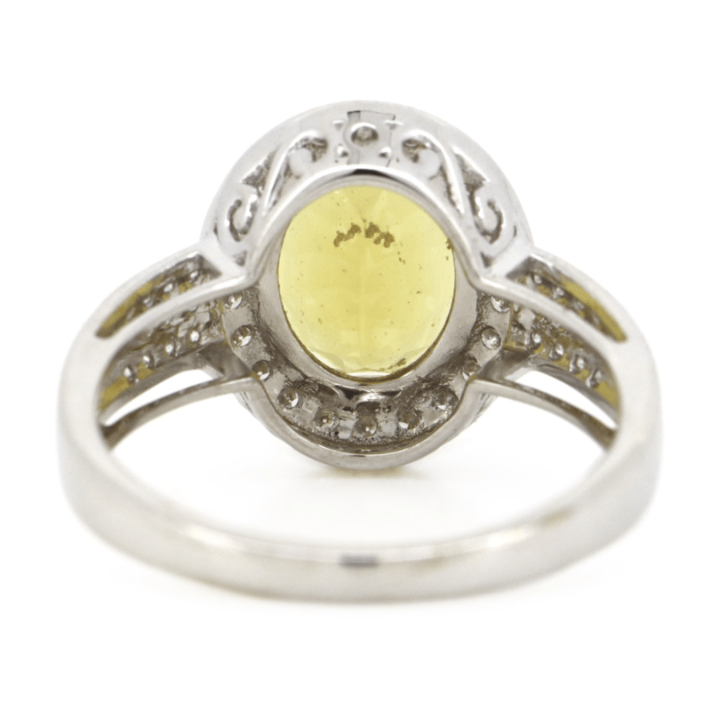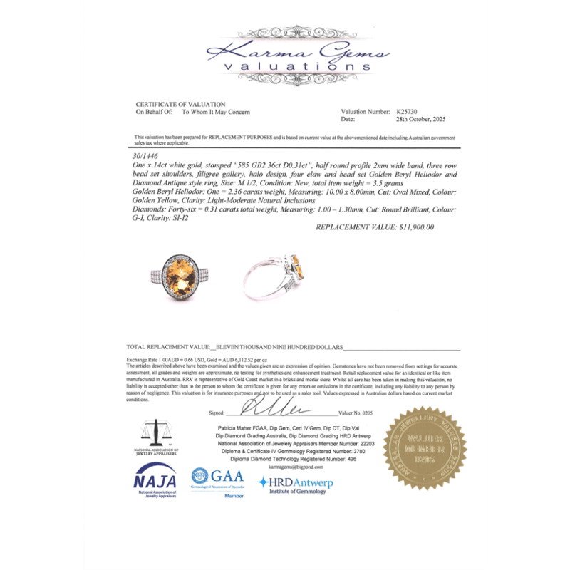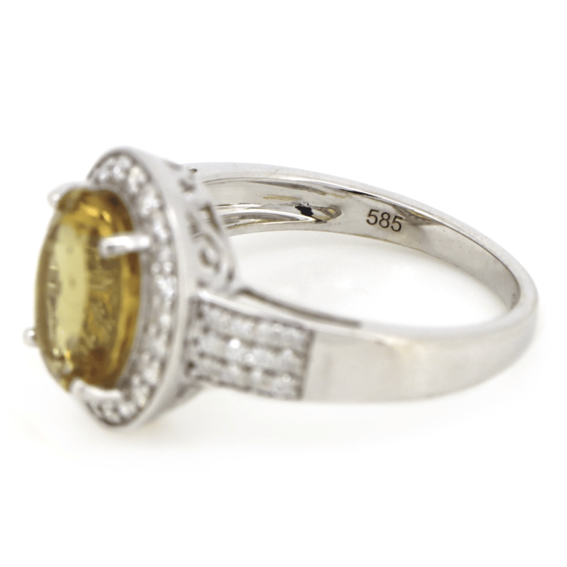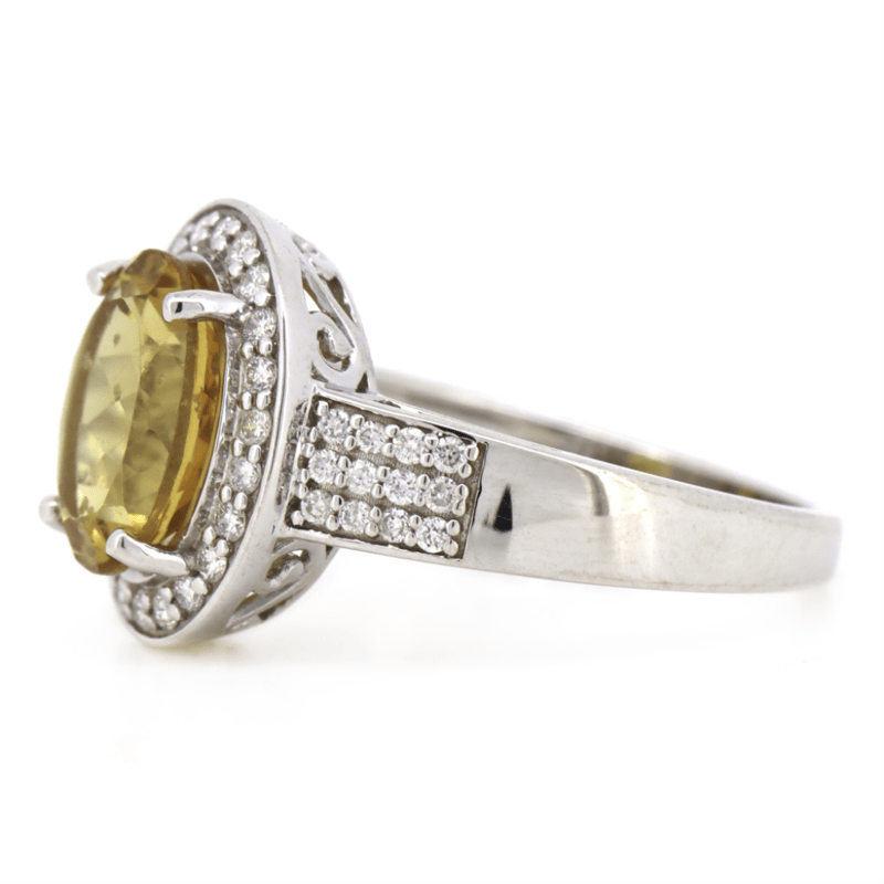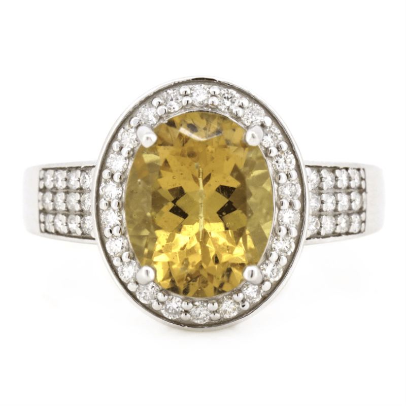 The Centre Features, One Oval Cut, Golden Yellow, Heliodor (2.36Ct Tsw, Light-Moderate Inclusions), Claw Set. Surrounding The Centre In A Halo And Decorating The Band Are, 46 Round Brilliant Cut, Diamonds (0.31Ct Tdw, G-I Colour, Si-I2), Bead Set. Ring Size M 1/2.