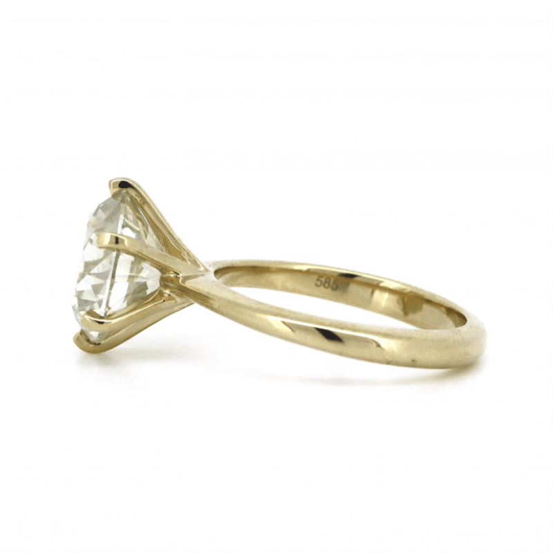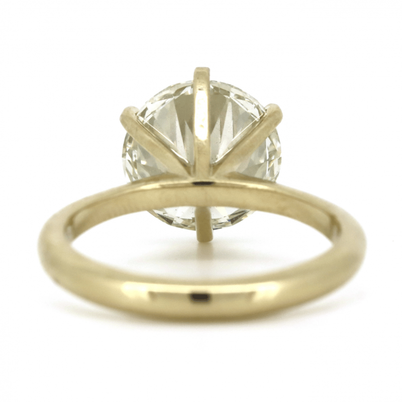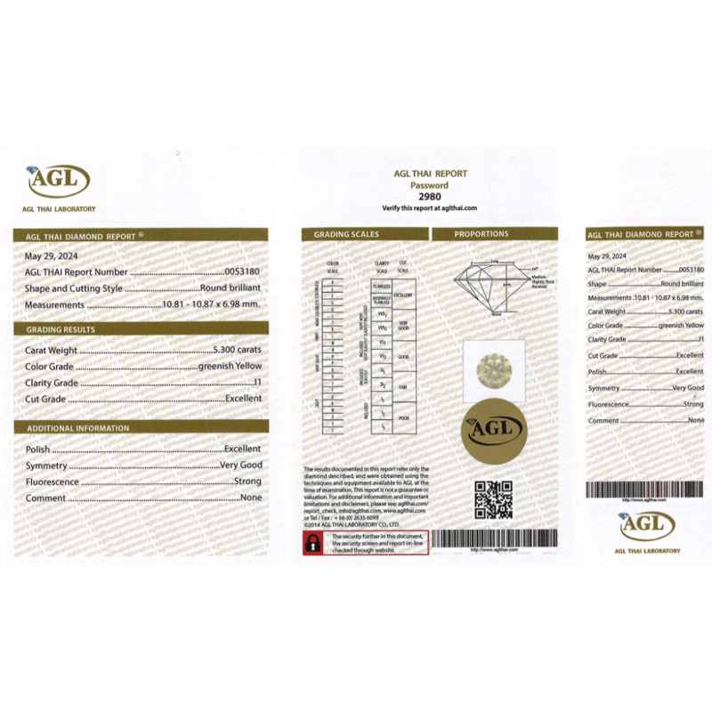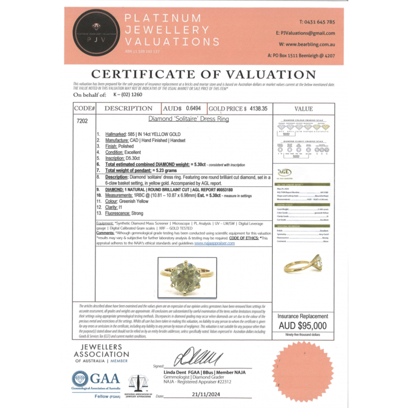 The Centre Features, One Round Brilliant Cut, Greenish-Yellow, Diamond (5.30Ct, I1 Clarity), 6 Claw Set. Ring Size O.