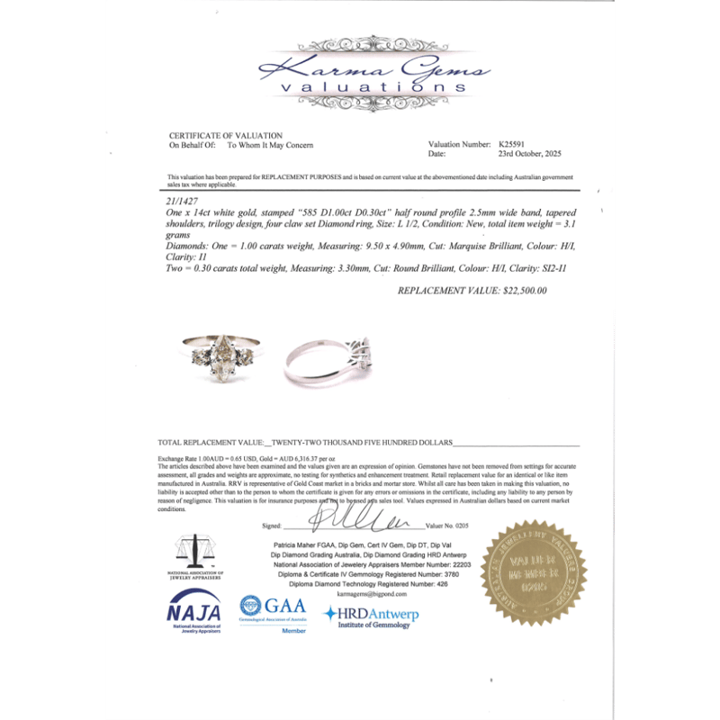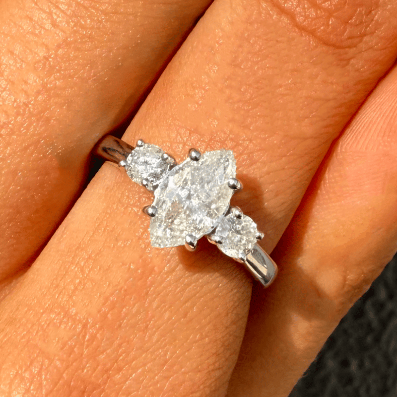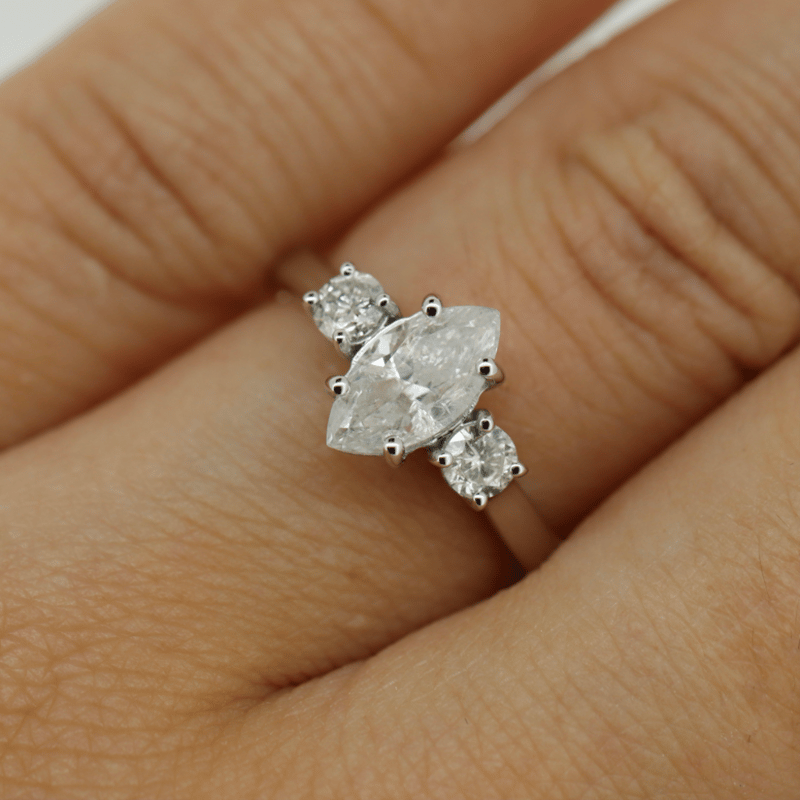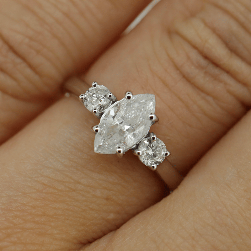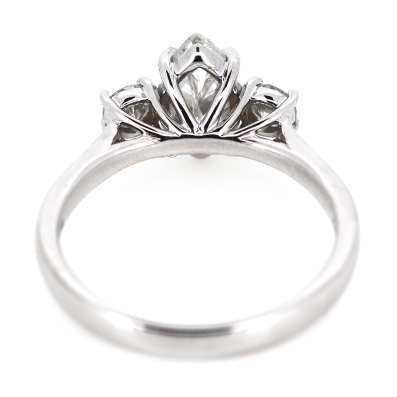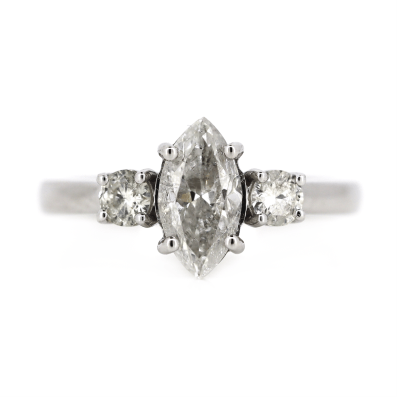 The Centre Features, One Marquise Cut, Diamond (1.00Ct, H-I Colour, I1 Clarity), 4 Claw Set. Accompanied By, 2 Round Brilliant Cut, Diamonds (0.30Ct Tdw, H-I Colour, Si2-I1 Clarity), Claw Set. Ring Size L 1/2.