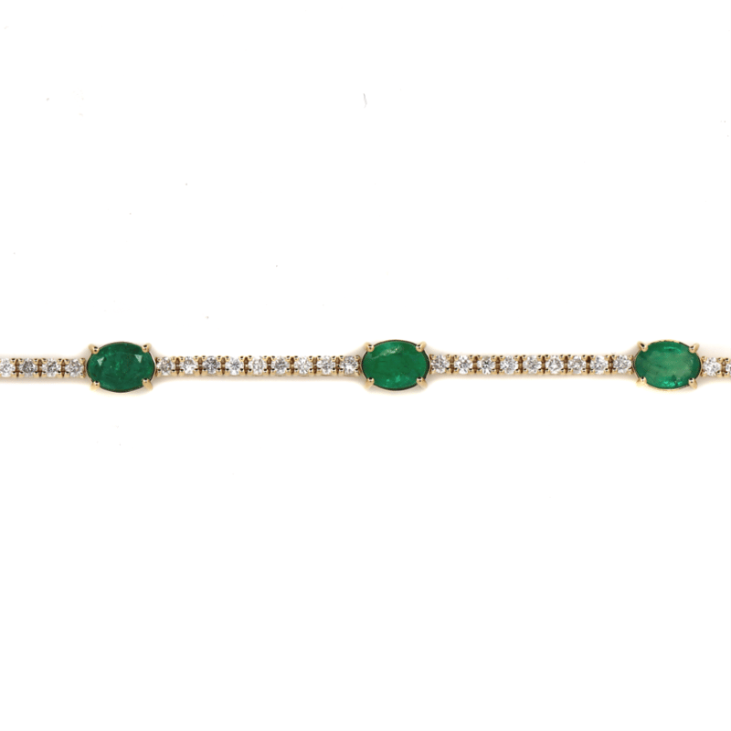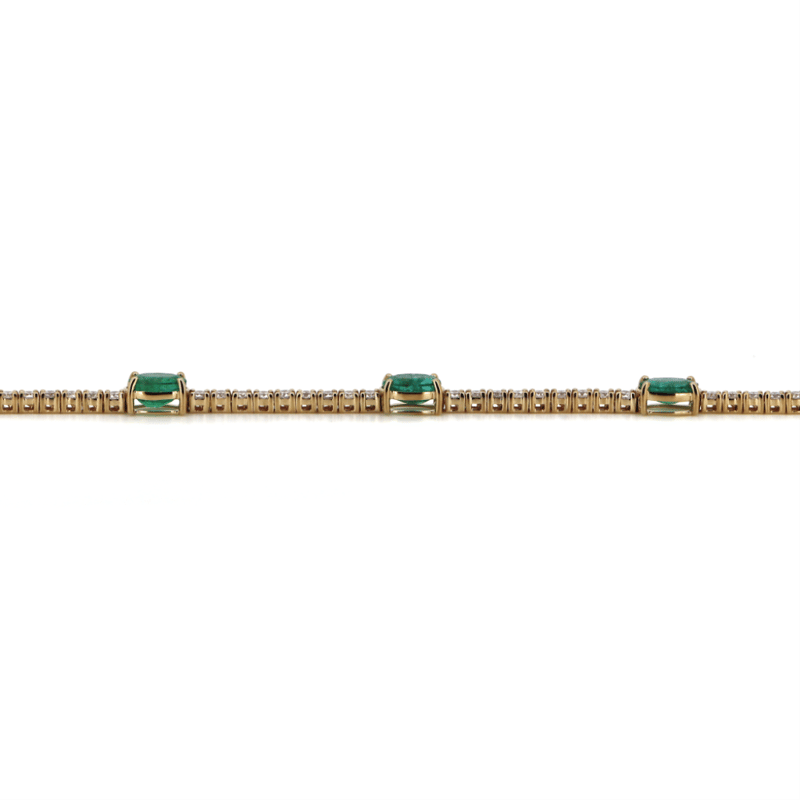 14K YELLOW GOLD, EMERALD AND DIAMOND, LINE BRACELET.