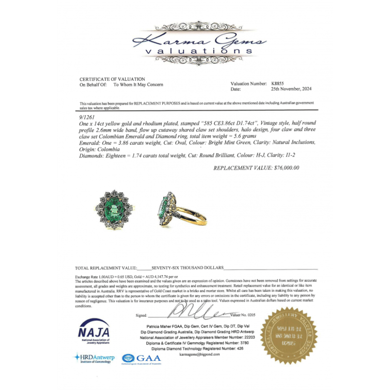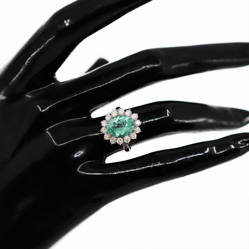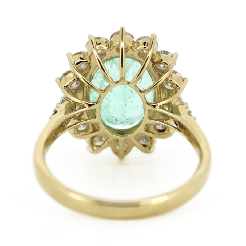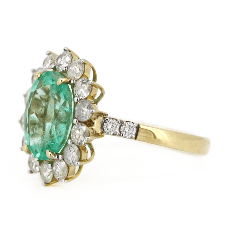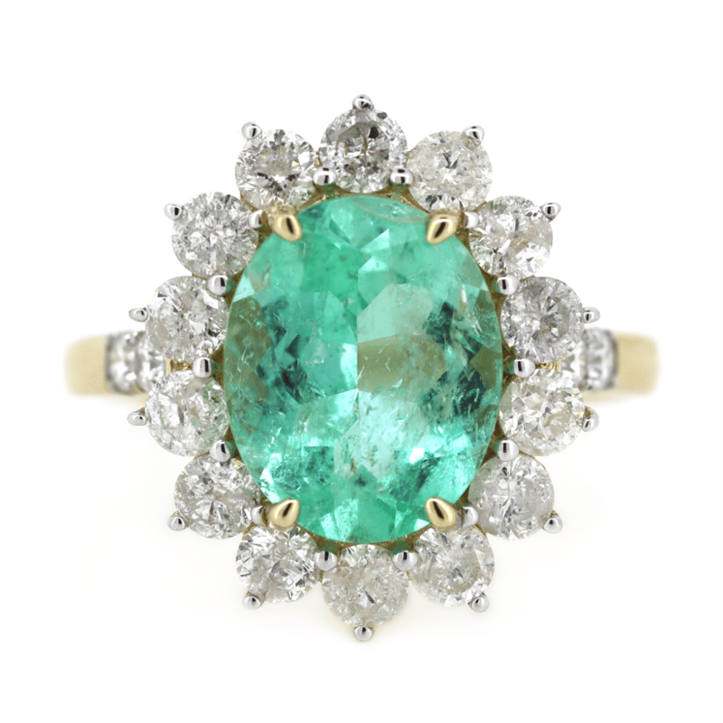 The Centre Features, One Oval Cut, Bright Mint Green, Colombian Emerald (3.86Ct, Naturally Included), Multi-Claw Set. Surrounding The Centre In A Halo And Decorating Shoulders Are, 18 Round Brilliant Cut, Diamonds (1.74Ct Tdw, H-J Colour, I1-I2 Clarity), Claw Set In White Gold. Ring Size R.