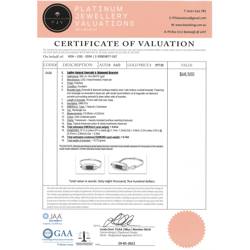 The Design Features, One Rectangle Cut, Dark Moderate Green, Emerald (6.01Ct, Heavily Included, Surface Reaching Fractures, Enhanced), Bezel Set. Decorating The Centre Are, 2 Baguette Cut, Diamonds (0.30Ct Tdw, H Colour, Vs+ Clarity), Bezel Set. Accompanying Are, 57 Round Brilliant Cut, Diamonds (0.44Ct Tdw, I-J Colour, P1+ Clarity), Micro-Claw Set. The Bracelet Has A Fold Over Clasp. Bracelet Length Is 16Cm.
