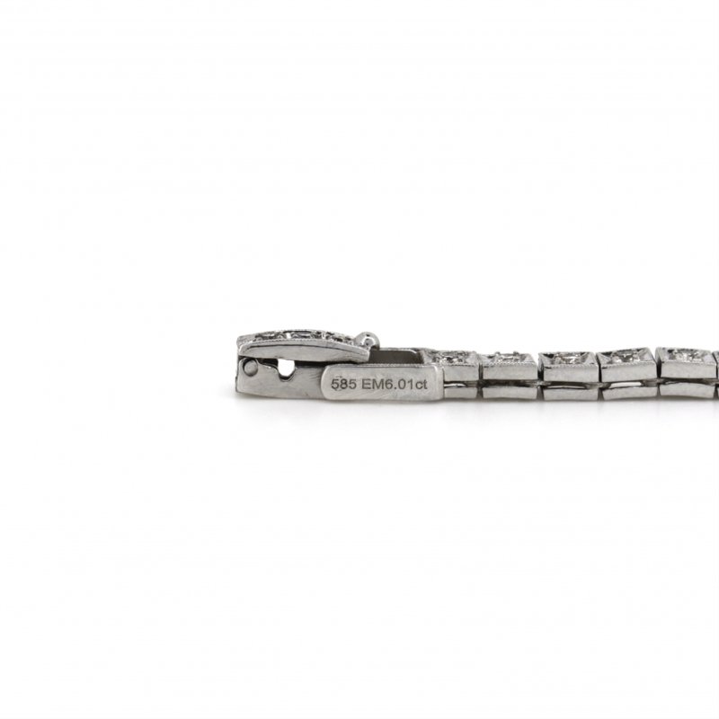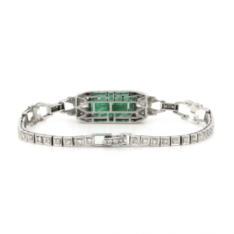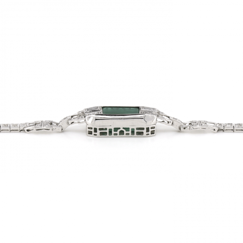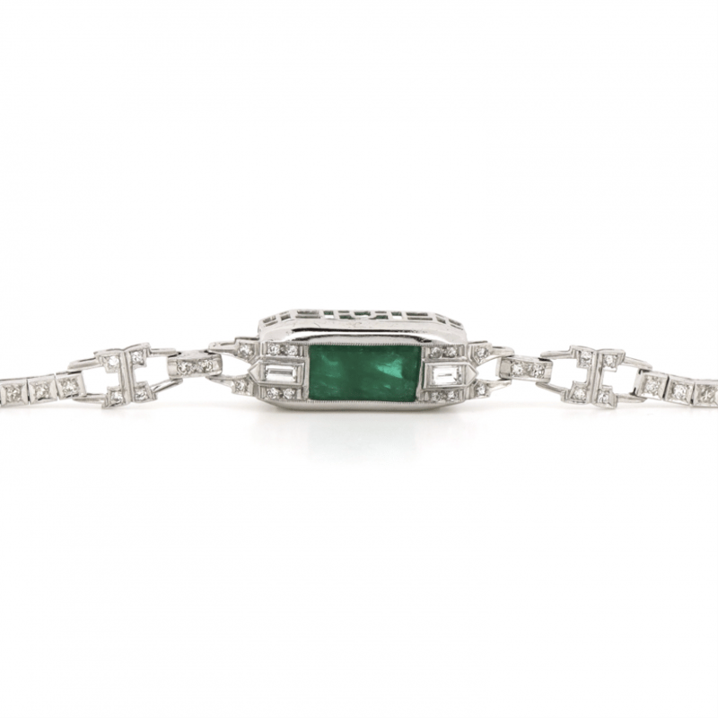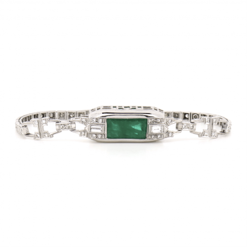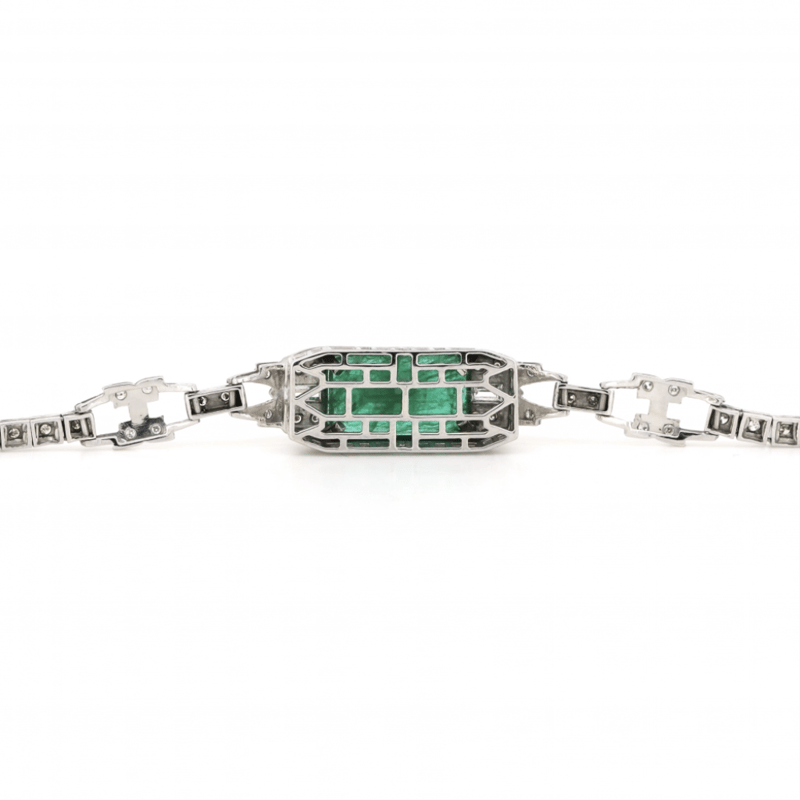 14K WHITE GOLD, 6.01CT COLOMBIAN EMERALD AND DIAMOND, ANTIQUE INSPIRED BRACELET.