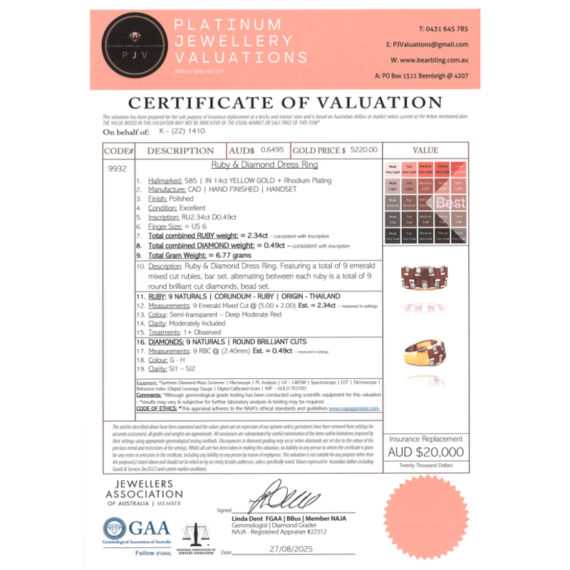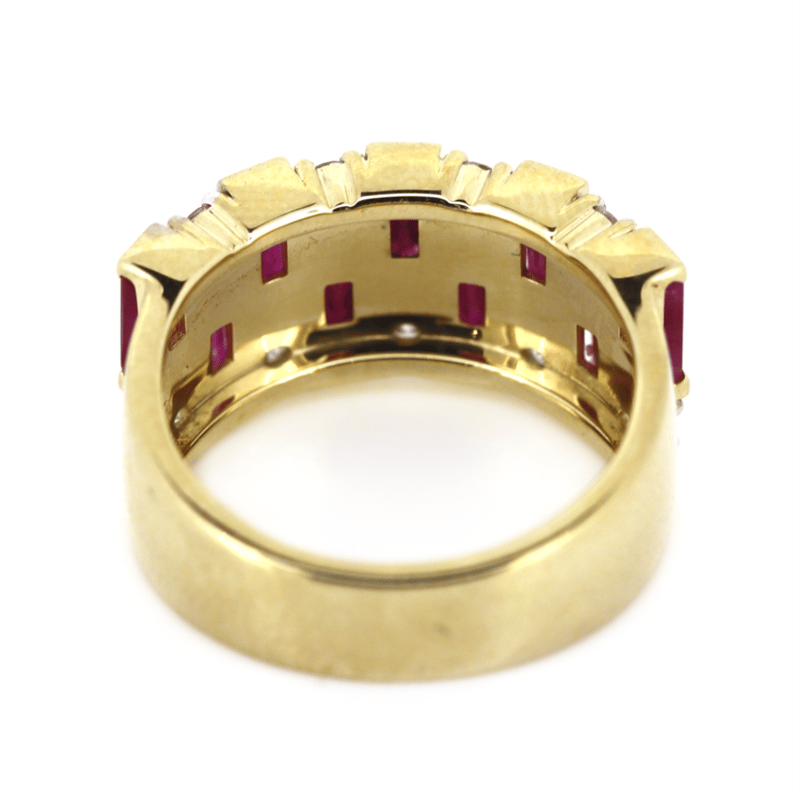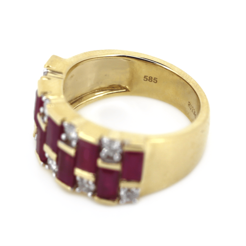 The Design Features, 9 Emerald Mixed Cut, Deep Moderate Red, Rubies (2.34Ct Tsw, Moderately Included, Enhanced), Bar Set. Accompanied By, 9 Round Brilliant Cut, Diamonds (0.49Ct Tdw, G-H Colour, Si1-Si2 Clarity), Bead Set. Ring Size L.