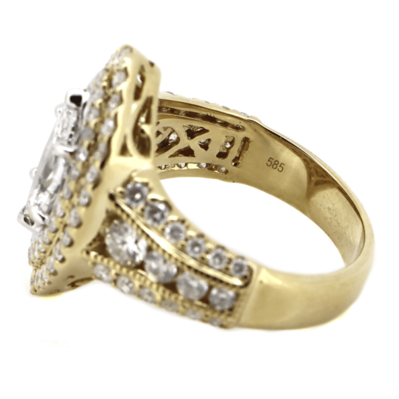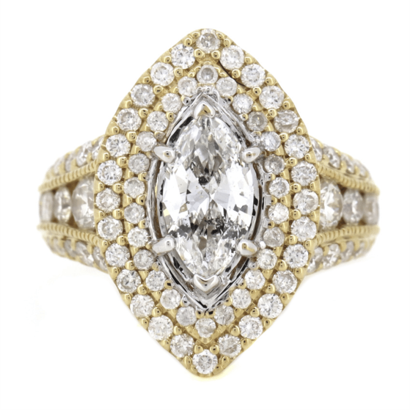 The Centre Features, One Marquise Modified Brilliant Cut, Diamond (1.21Ct, H-J Colour, P2 Clarity), Claw Set. Surrounding The Centre In A Double Halo And Decorating The Band Are, 86 Round Brilliant Cut, Diamonds (1.73Ct Tdw, H-J Colour, P2+ Clarity), Bead/Pip-Claw/Channel Set With Millegrain Detail. Ring Size O.