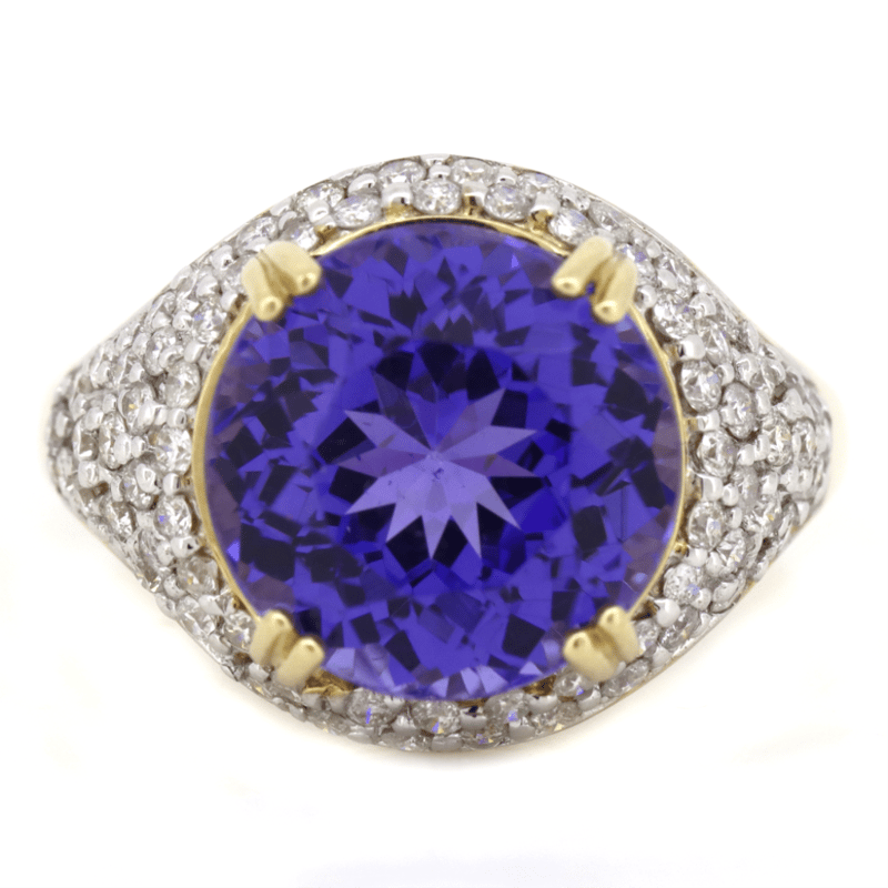 The Centre Features, One Round Cut, Purple Violet, Tanzanite (6.46Ct, Slightly Included, Enhanced), Double Claw Set. Embellishing The Design Are, 70 Round Brilliant Cut, Diamonds (0.68Ct Tdw, G-H Colour, Si1-Si2 Clarity), Pave Set In White Gold. Ring Size M 1/2.
