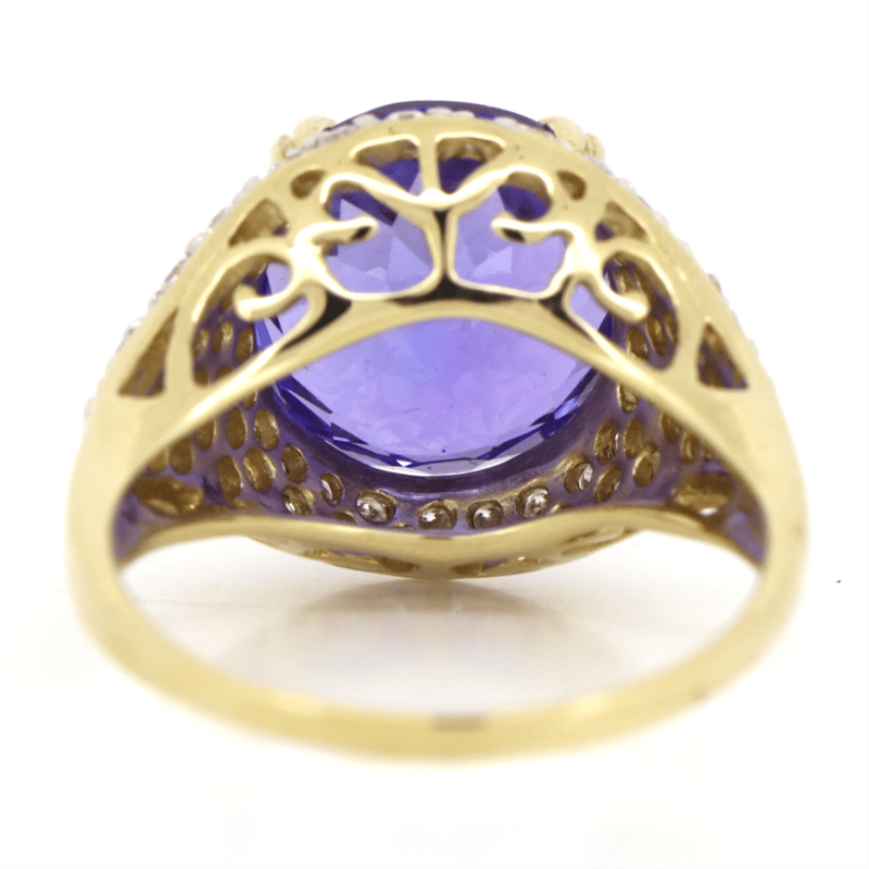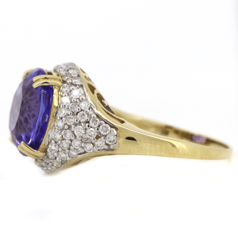14K YELLOW GOLD, TANZANITE AND DIAMOND, CLUSTER RING.