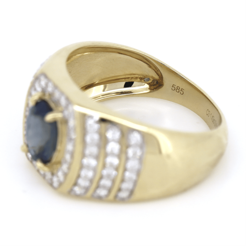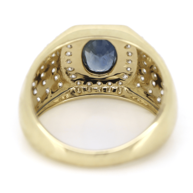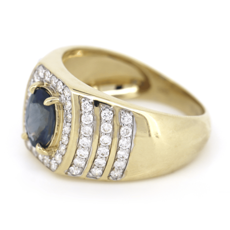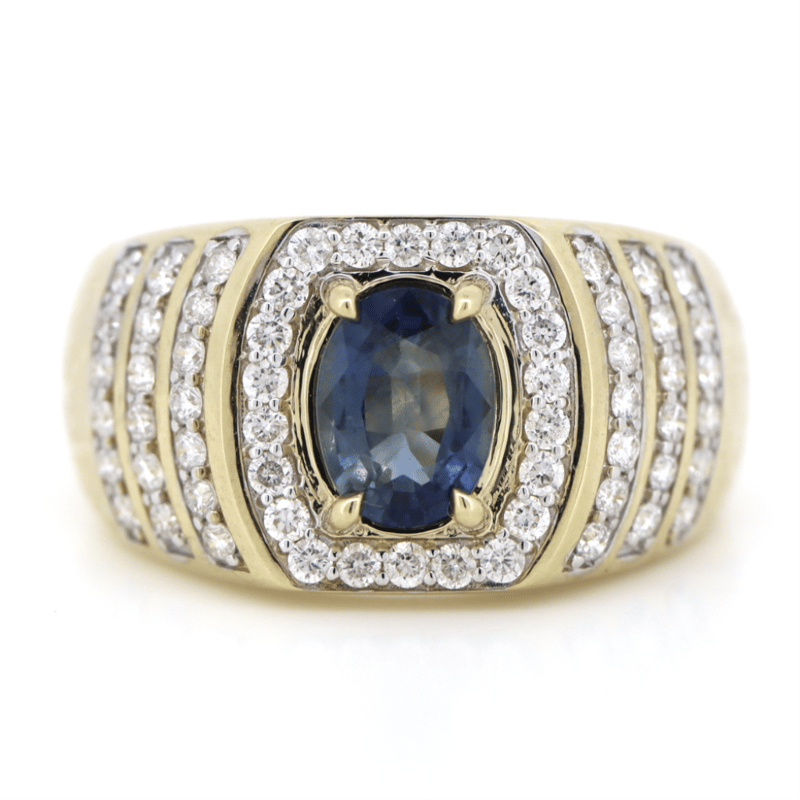 The Centre Features, One Oval Cut, Medium Violet Blue, Ceylon Sapphire (1.43Ct, Moderate-Heavy Inclusions), 4 Claw Set. Encompassing The Centre Are, 60 Round Brilliant Cut, Diamonds (0.88Ct Tdw, H-J Colour, Si-I2 Clarity), Claw Set. Ring Size R/12.