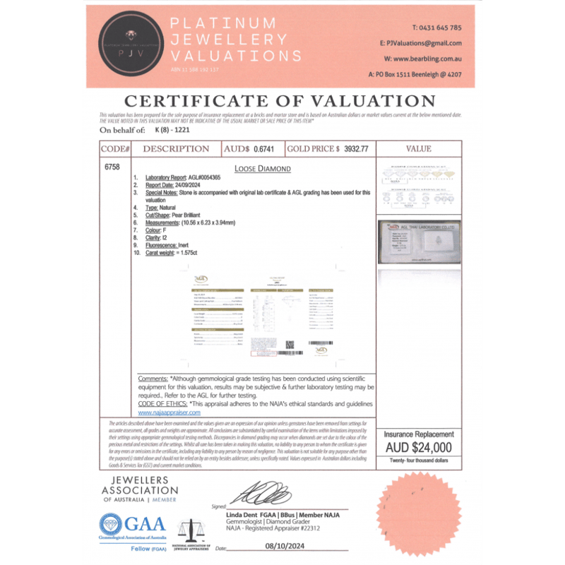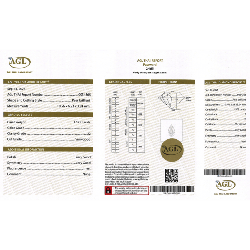 Pear Brilliant Cut, F Colour, I2 Clarity, Loose, Unset. Stone Comes Sealed With Agl Report: 0054365.